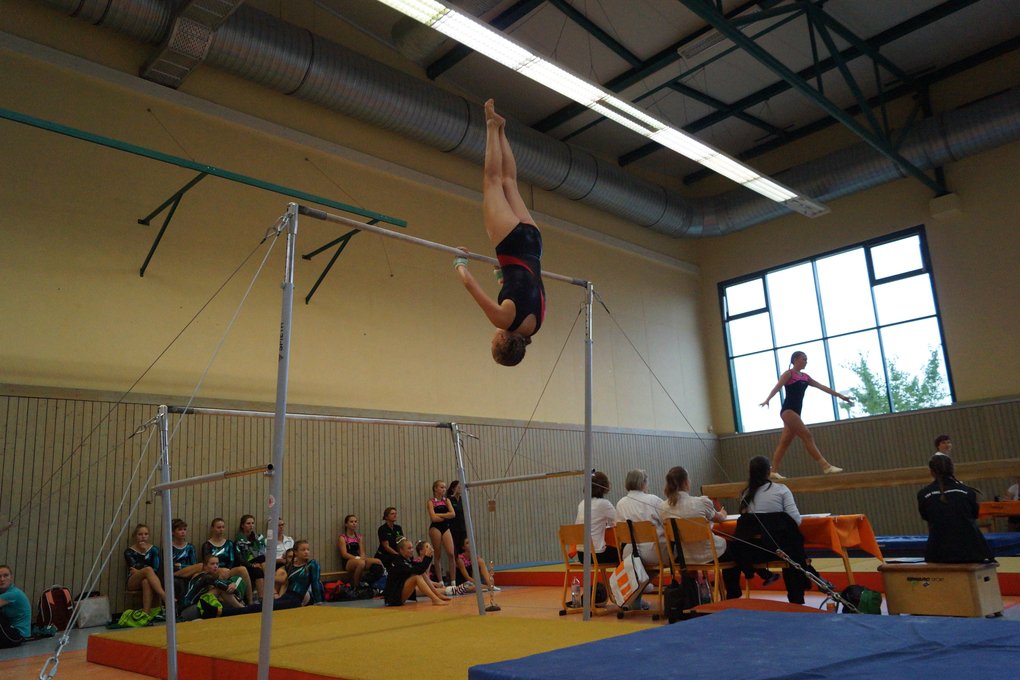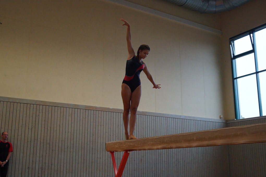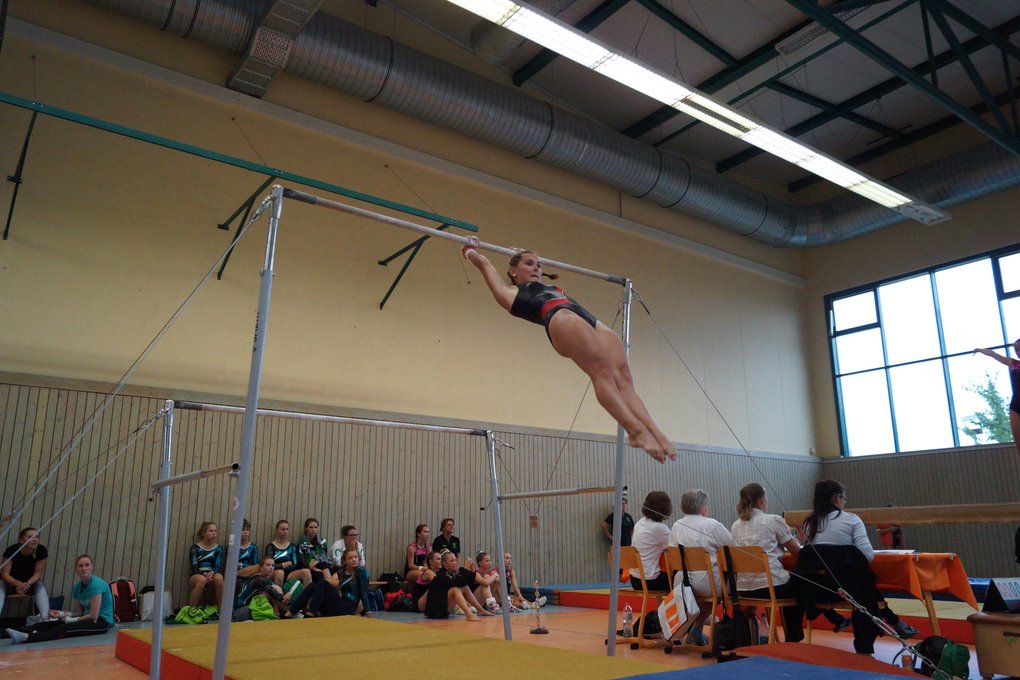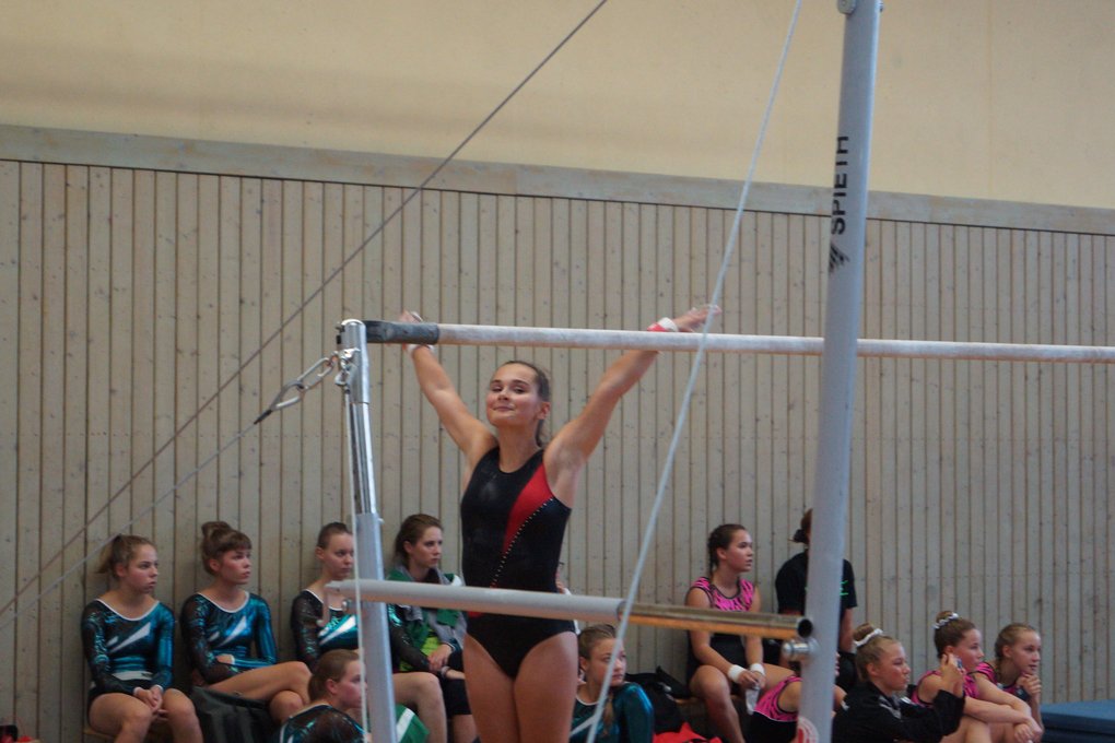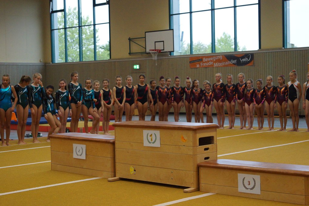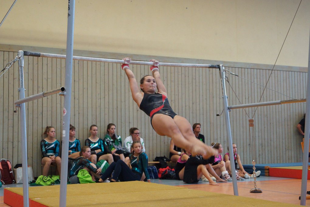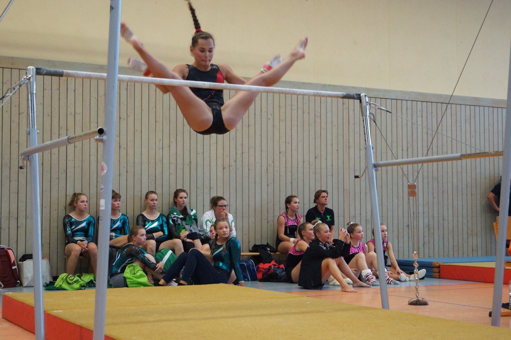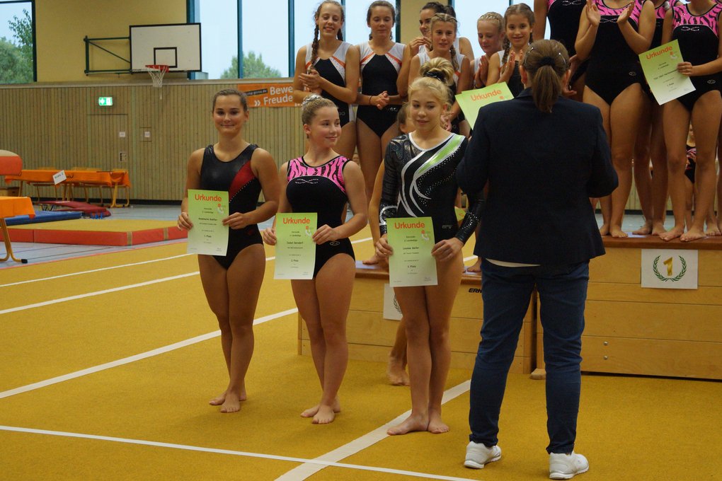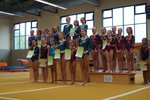 Am Nachmittag ging unsere Frauenmannschaft LK 2 in der gleichen Gerätereihenfolge an den Start. Am Stufenbarren lagen alle Mannschaften ungefähr gleich auf. Am Balken zeigte sich die Routine unserer Starterinnen und es wurde das beste Ergebniss allen gestarteten Mannschaften. Leider haben wir nach wie vor Defizite am Boden, die sich vor allem in den Ausgangswerten zeigen. Das schwächste Gerät unserer Mannschaft aber war der Sprung, was sicher auch am Wettkampftermin lag, denn bei mancher Turnerin machte sich die lange Sommerferienpause noch durch fehlende Kondition bemerkbar. Bei der Siegerehrung gab es dann eine kleine Überraschung, denn Punktgleich mit der Mannschaft auf Platz drei, reichte das Ergebnis rechnerisch dann für den angestrebten 4. Platz, was der Frauenmannschaft die Relegation erspart.