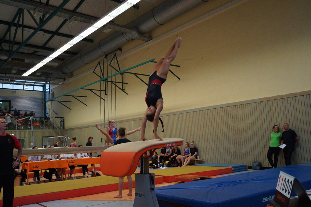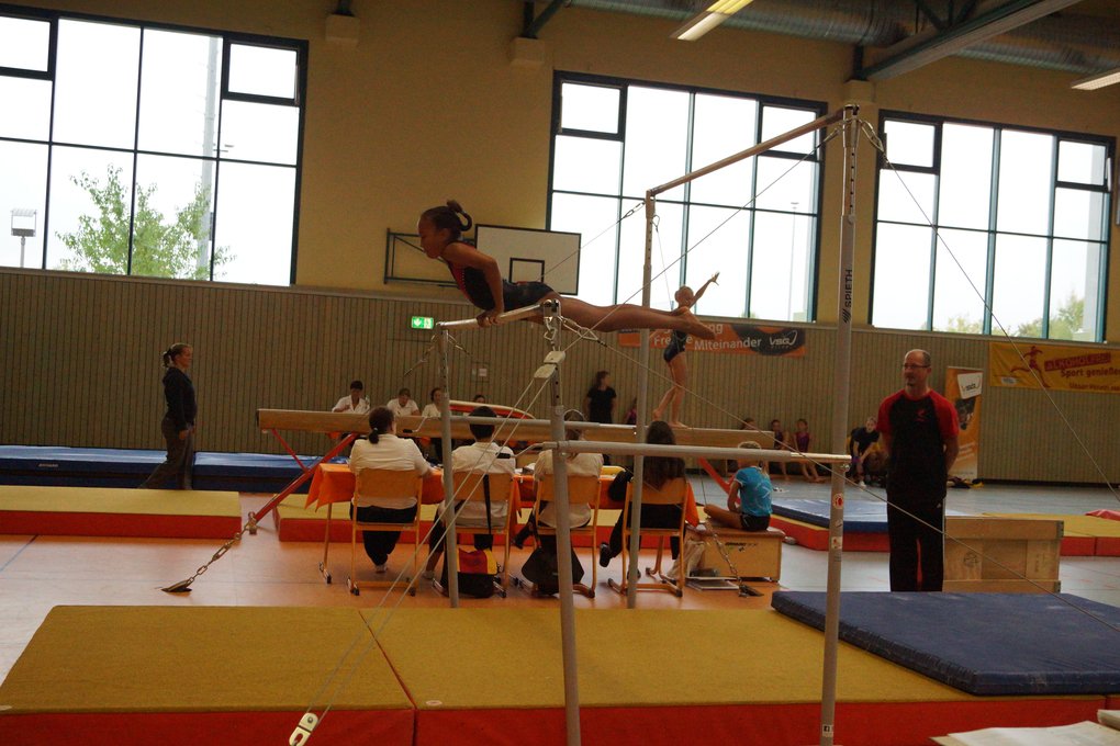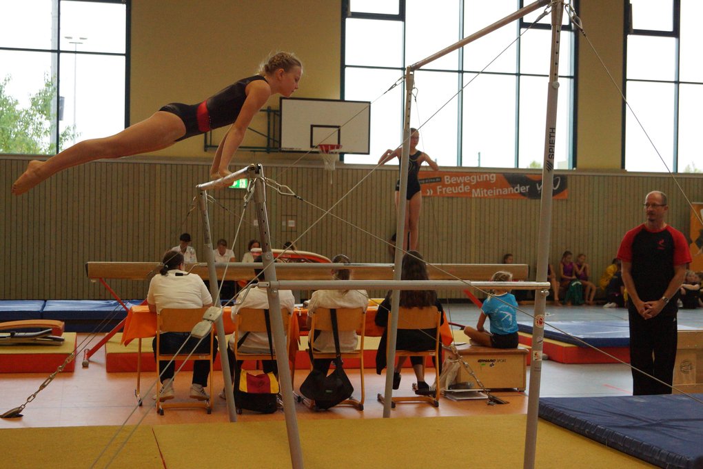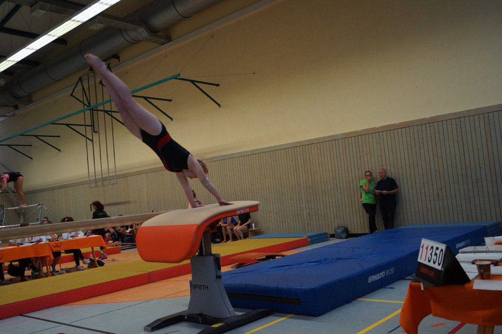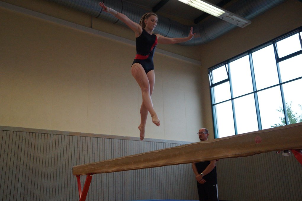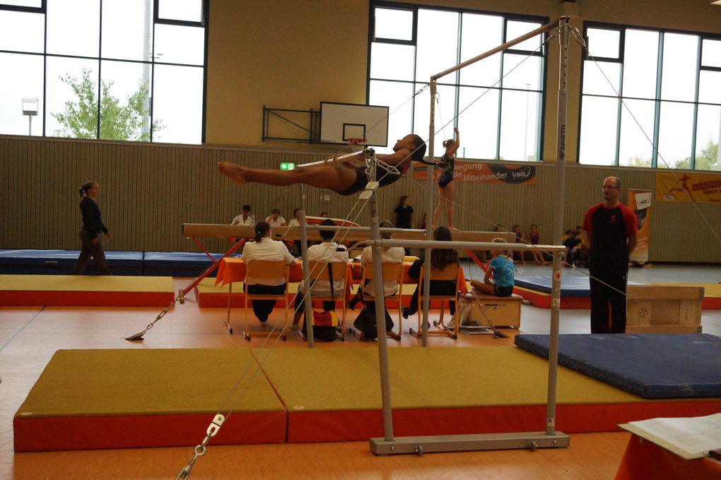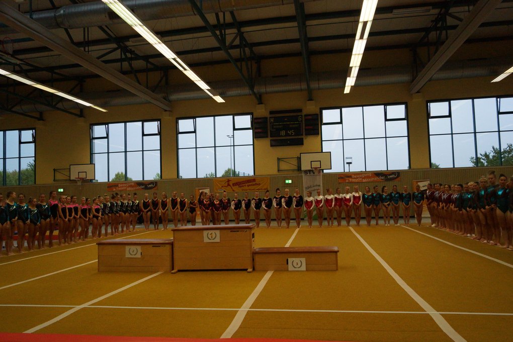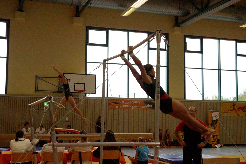 Am Nachmittag ging unsere Frauenmannschaft LK 2 in der gleichen Gerätereihenfolge an den Start. Am Stufenbarren lagen alle Mannschaften ungefähr gleich auf. Am Balken zeigte sich die Routine unserer Starterinnen und es wurde das beste Ergebniss allen gestarteten Mannschaften. Leider haben wir nach wie vor Defizite am Boden, die sich vor allem in den Ausgangswerten zeigen. Das schwächste Gerät unserer Mannschaft aber war der Sprung, was sicher auch am Wettkampftermin lag, denn bei mancher Turnerin machte sich die lange Sommerferienpause noch durch fehlende Kondition bemerkbar. Bei der Siegerehrung gab es dann eine kleine Überraschung, denn Punktgleich mit der Mannschaft auf Platz drei, reichte das Ergebnis rechnerisch dann für den angestrebten 4. Platz, was der Frauenmannschaft die Relegation erspart.