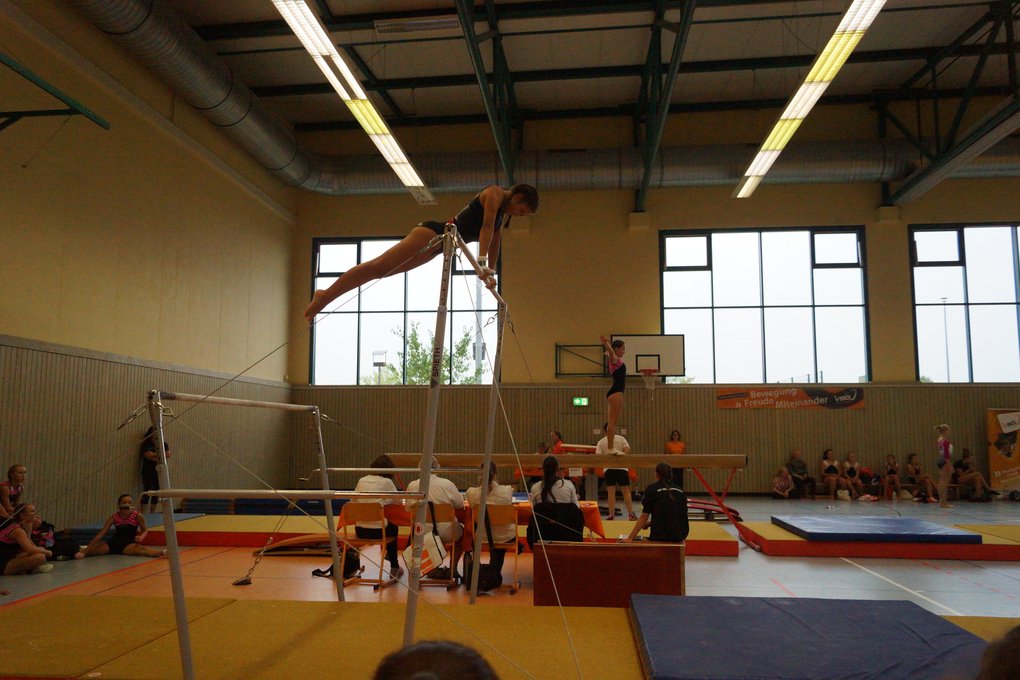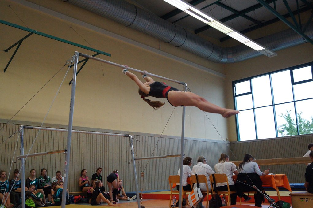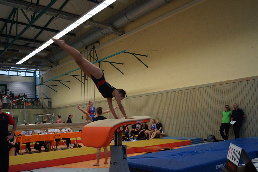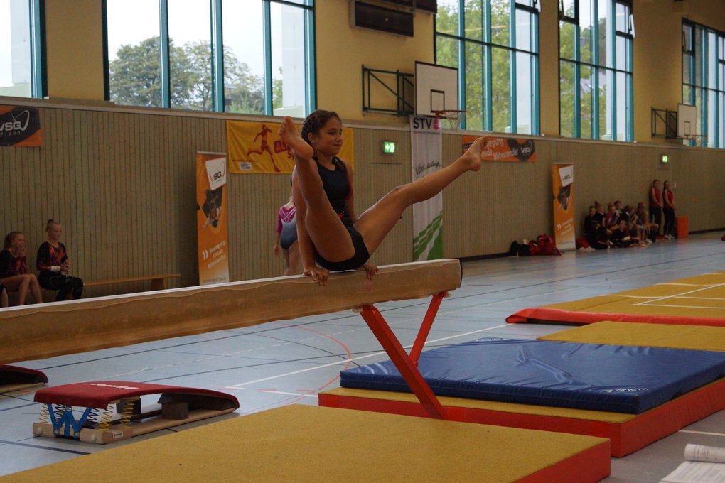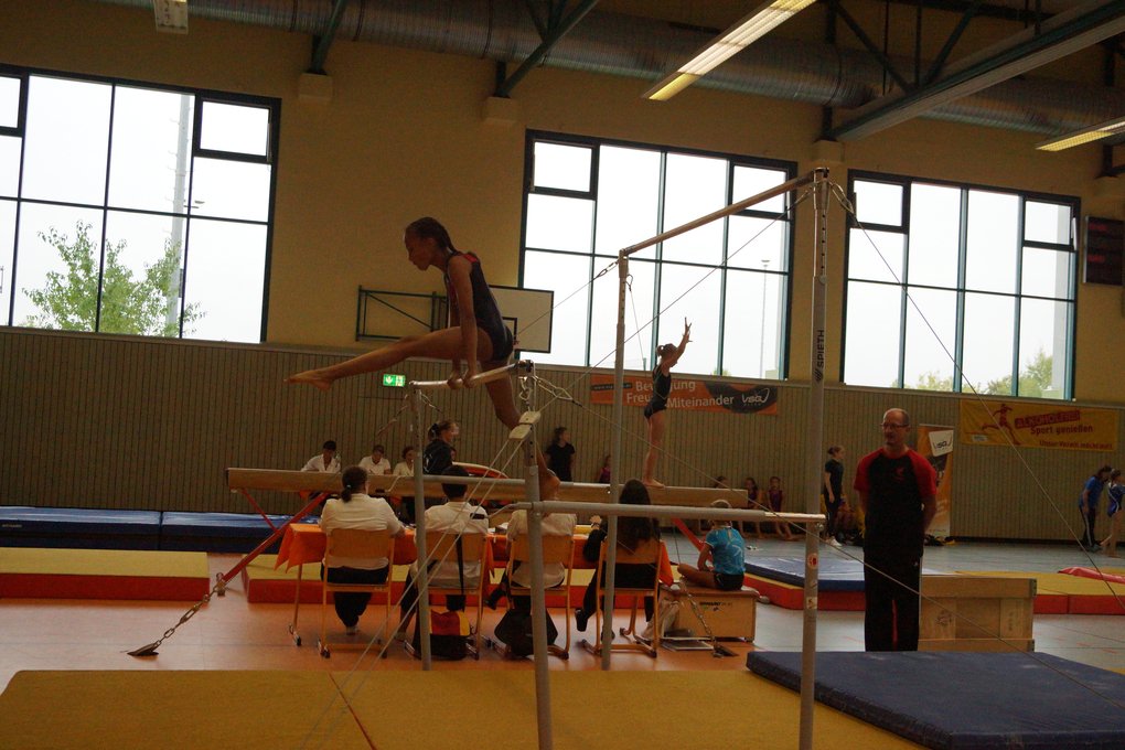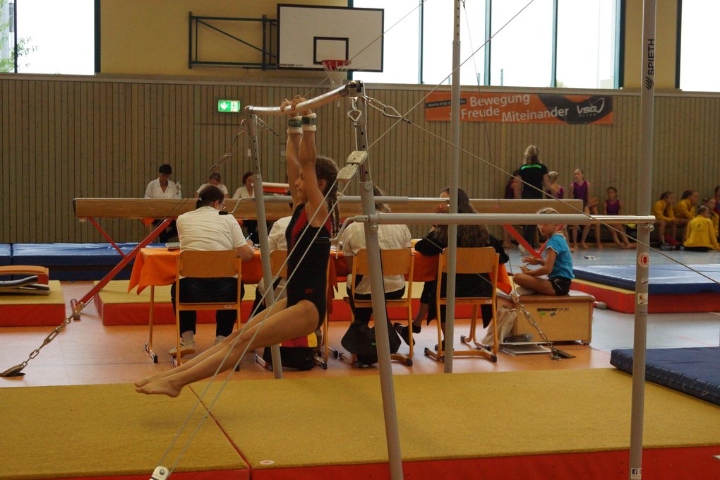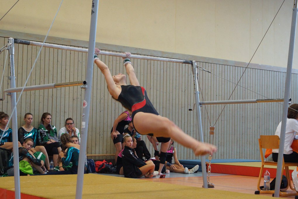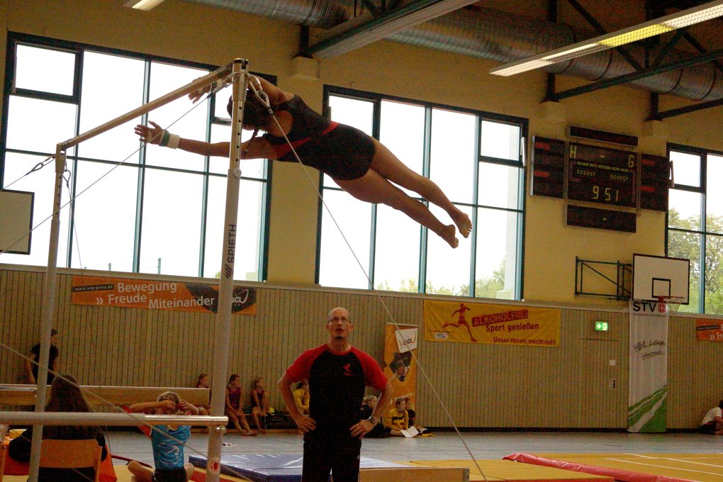 Am Nachmittag ging unsere Frauenmannschaft LK 2 in der gleichen Gerätereihenfolge an den Start. Am Stufenbarren lagen alle Mannschaften ungefähr gleich auf. Am Balken zeigte sich die Routine unserer Starterinnen und es wurde das beste Ergebniss allen gestarteten Mannschaften. Leider haben wir nach wie vor Defizite am Boden, die sich vor allem in den Ausgangswerten zeigen. Das schwächste Gerät unserer Mannschaft aber war der Sprung, was sicher auch am Wettkampftermin lag, denn bei mancher Turnerin machte sich die lange Sommerferienpause noch durch fehlende Kondition bemerkbar. Bei der Siegerehrung gab es dann eine kleine Überraschung, denn Punktgleich mit der Mannschaft auf Platz drei, reichte das Ergebnis rechnerisch dann für den angestrebten 4. Platz, was der Frauenmannschaft die Relegation erspart.