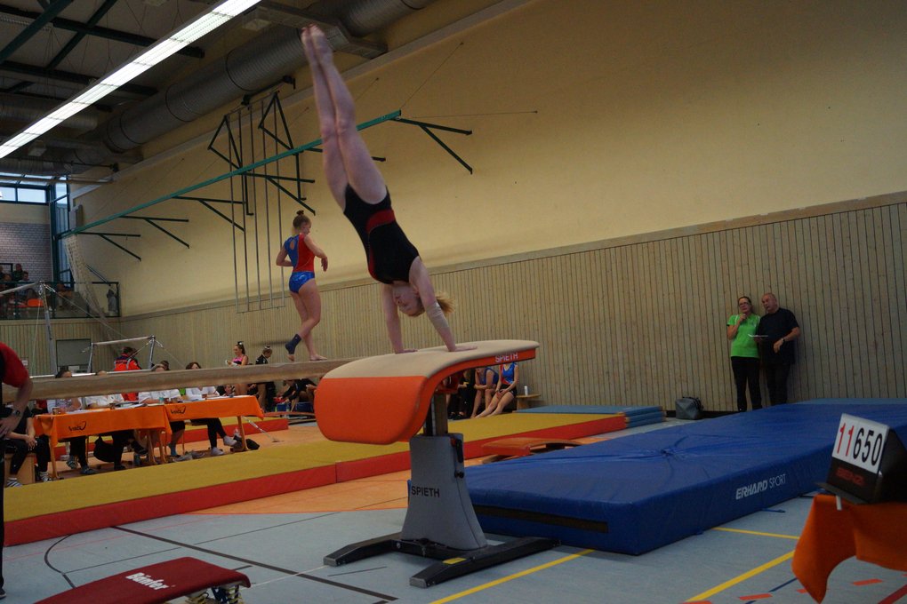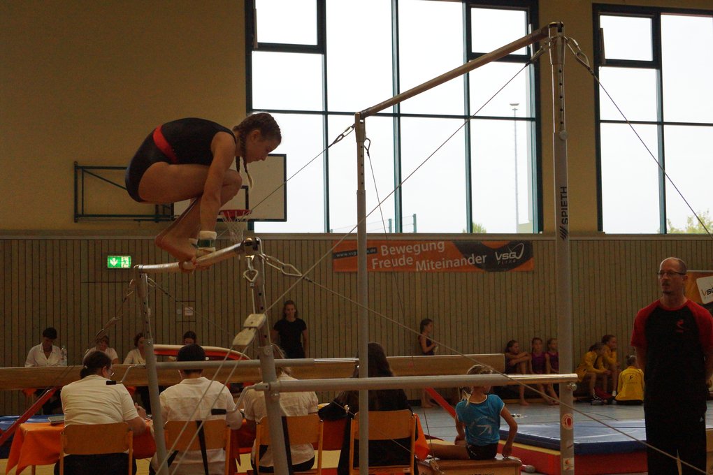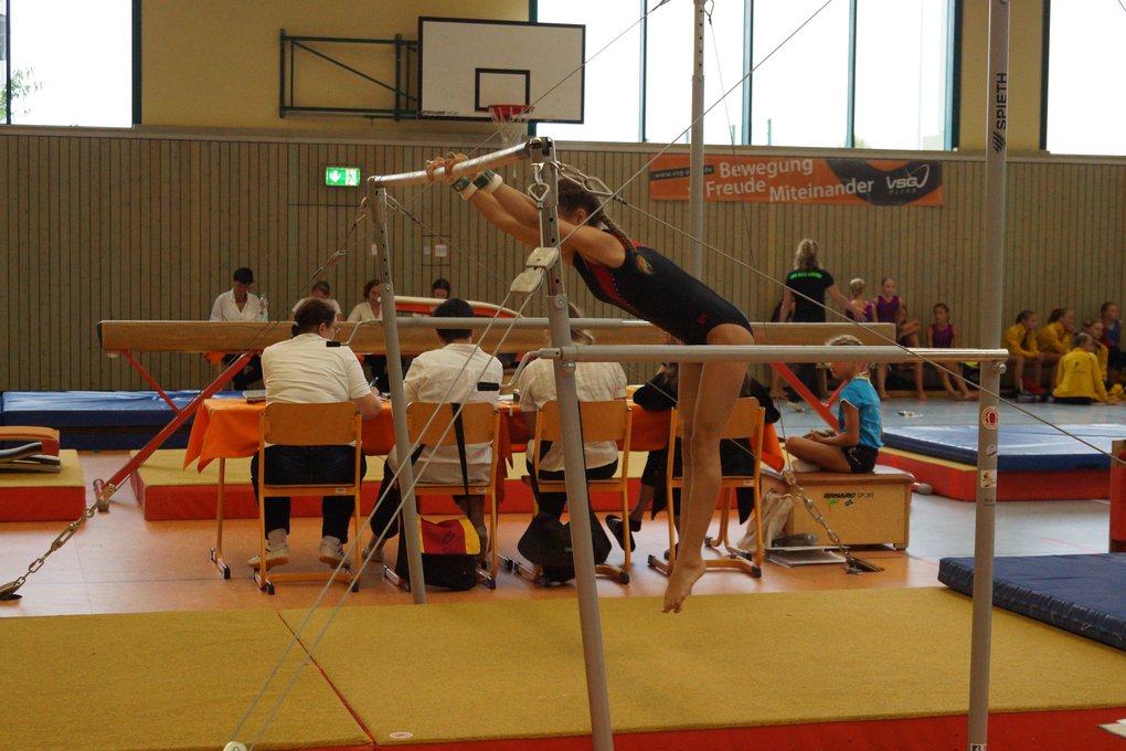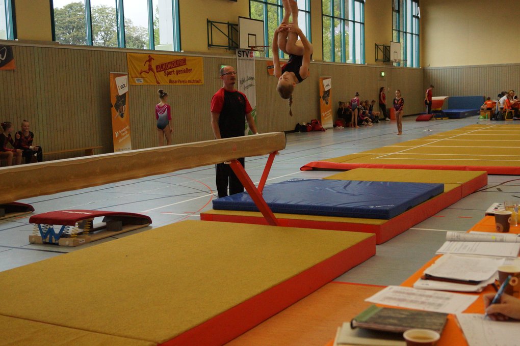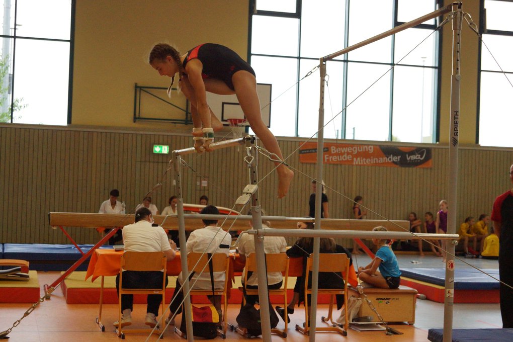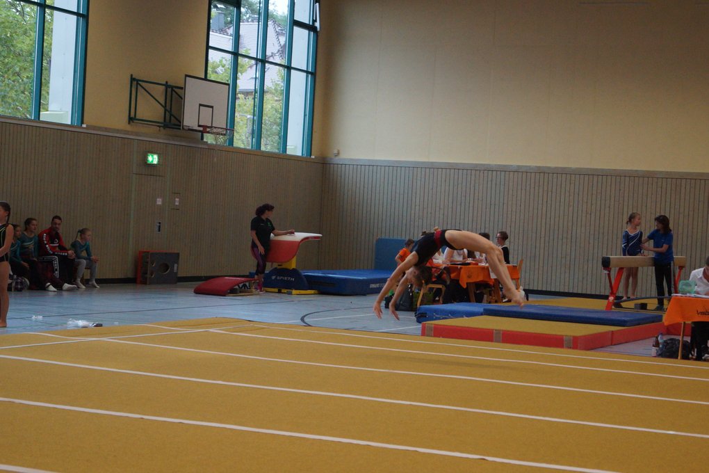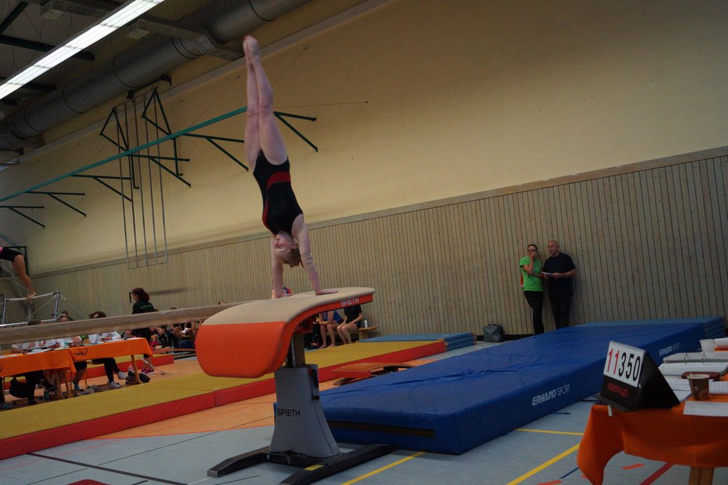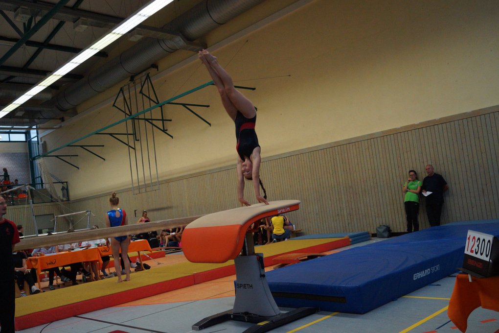 Am Nachmittag ging unsere Frauenmannschaft LK 2 in der gleichen Gerätereihenfolge an den Start. Am Stufenbarren lagen alle Mannschaften ungefähr gleich auf. Am Balken zeigte sich die Routine unserer Starterinnen und es wurde das beste Ergebniss allen gestarteten Mannschaften. Leider haben wir nach wie vor Defizite am Boden, die sich vor allem in den Ausgangswerten zeigen. Das schwächste Gerät unserer Mannschaft aber war der Sprung, was sicher auch am Wettkampftermin lag, denn bei mancher Turnerin machte sich die lange Sommerferienpause noch durch fehlende Kondition bemerkbar. Bei der Siegerehrung gab es dann eine kleine Überraschung, denn Punktgleich mit der Mannschaft auf Platz drei, reichte das Ergebnis rechnerisch dann für den angestrebten 4. Platz, was der Frauenmannschaft die Relegation erspart.