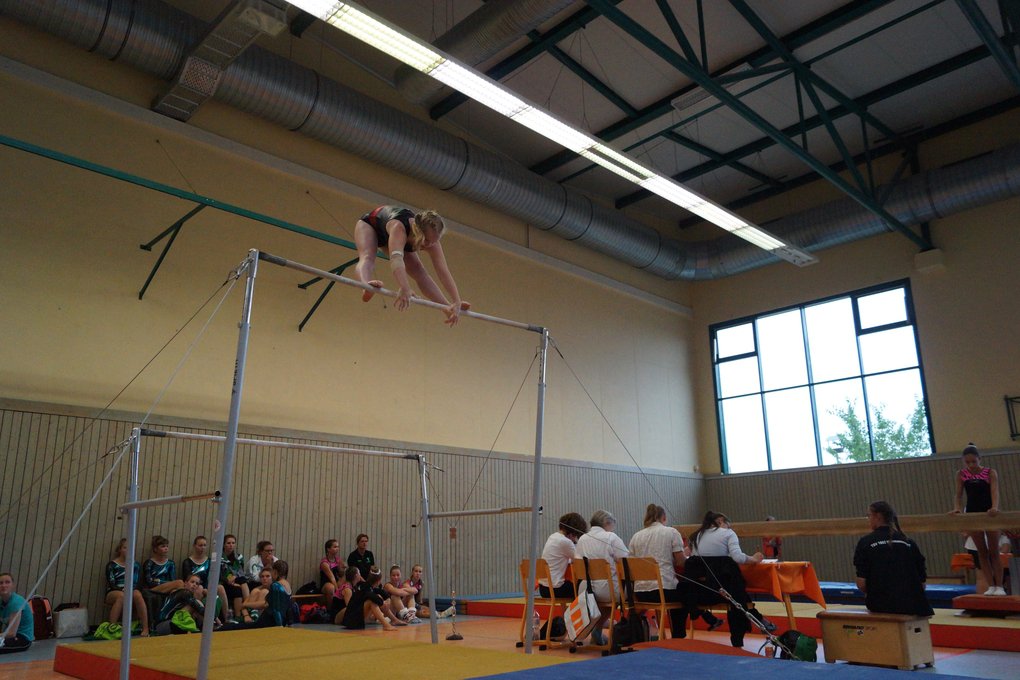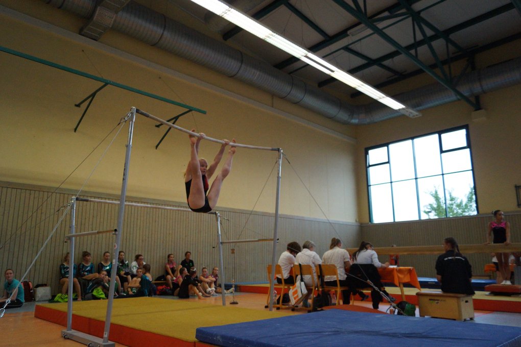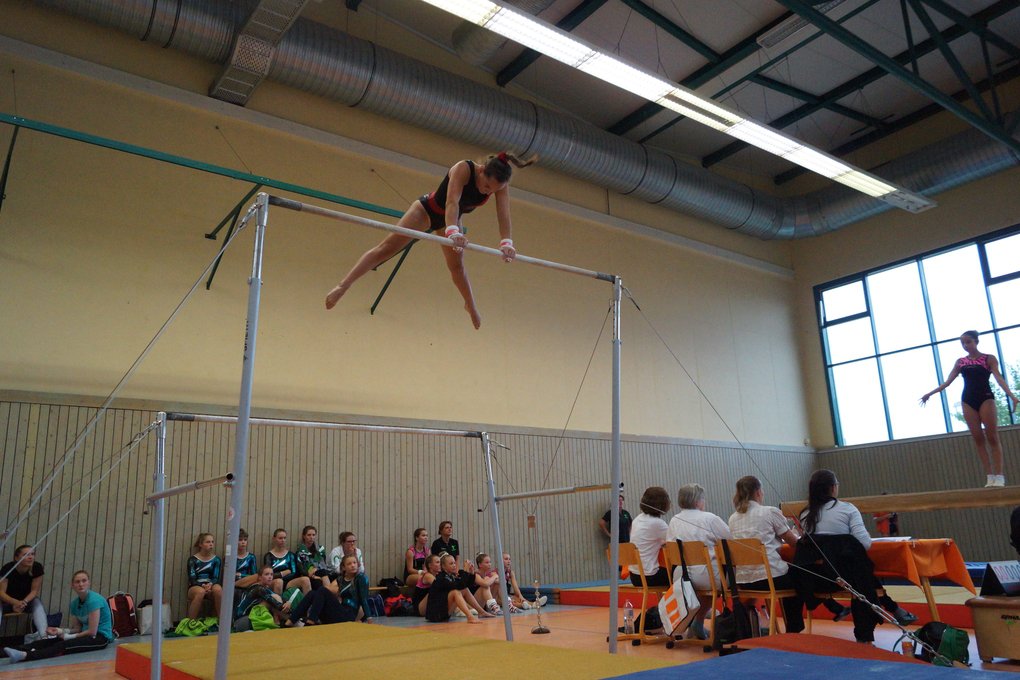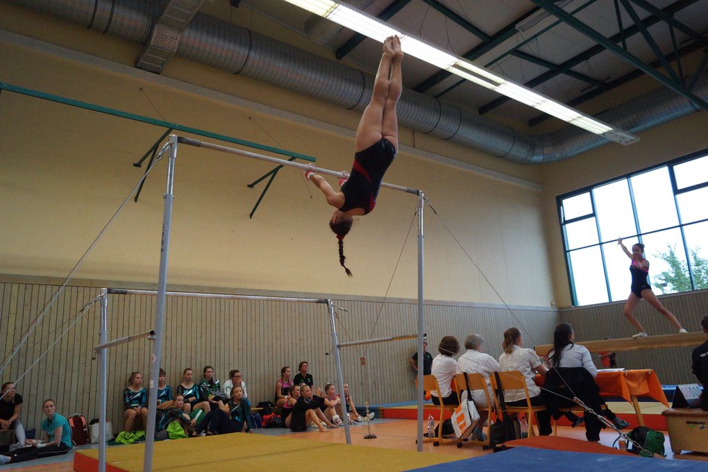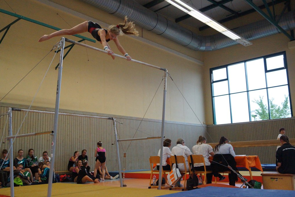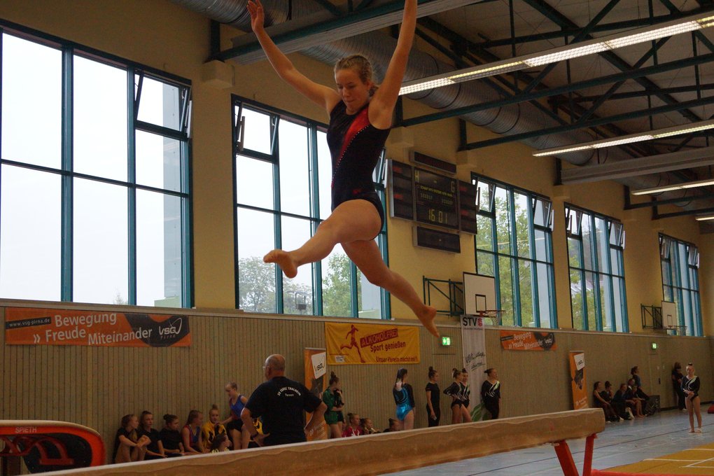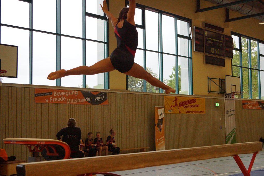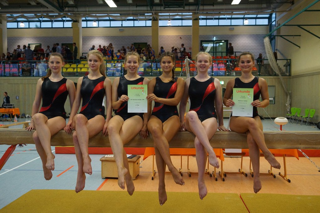 Nach nur drei Wochen Vorbereitung mussten sich unsere beiden Ligamannschaften in Pirna der schweren Aufgabe 2.Landesliga stellen. Vormittags begann unsere Mädchenmannschaft LK3. Mit viel Kampfgeist ging es an die Geräte. Nachdem am Stufenbarren alle ihre Übung präsentiert hatten, legte sich die erste Anspannung. Der Punktestand im Protokoll am Stufenbarren zeigte dann auch, das wir das beste Egebniss aller Mannschaften an diesem Gerät erturnten. Die anschließenden Übungen am Schwebebalken waren erwartungsgemäß noch etwas zittrig und alle waren froh das Gerät überstanden zu haben. Hier zeigten auch die anderen Mannschaften Nerven, was uns Platz drei an diesem Gerät bescherte. Weiter ging es zum Boden. Hier machte sich der Trainingsrückstand noch am deutlichsten bemerkbar. Auf der 12x12 m großen Matte wirkten unsere Übungen sehr zaghaft, was auch die Wertungen widerspiegelten. Nach dieser kleinen Enttäuschung ging es weiter zum Sprung. Dort gab es von Jasmin den besten Überschlag an diesem Tag. Auch die Anderen zeigten solide Sprünge. Nach diesem gelungenen Wettkampf war klar, dass wir uns keine Abstiegssorgen machen müssen. Der Jubel über den erreichten Platz 4 war entsprechend groß. Am Ende bedeutet dieser dismal sogar, dass wir im Oktober beim Relegationwettkampf noch einmal antreten dürfen.
