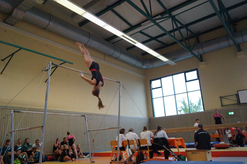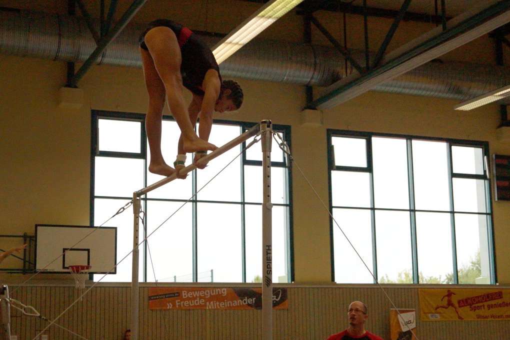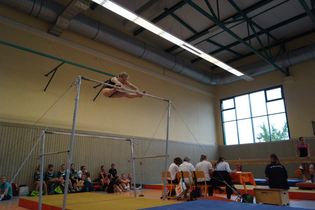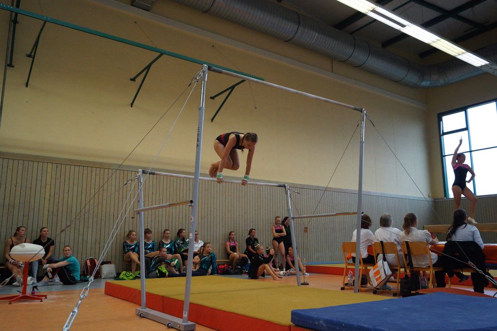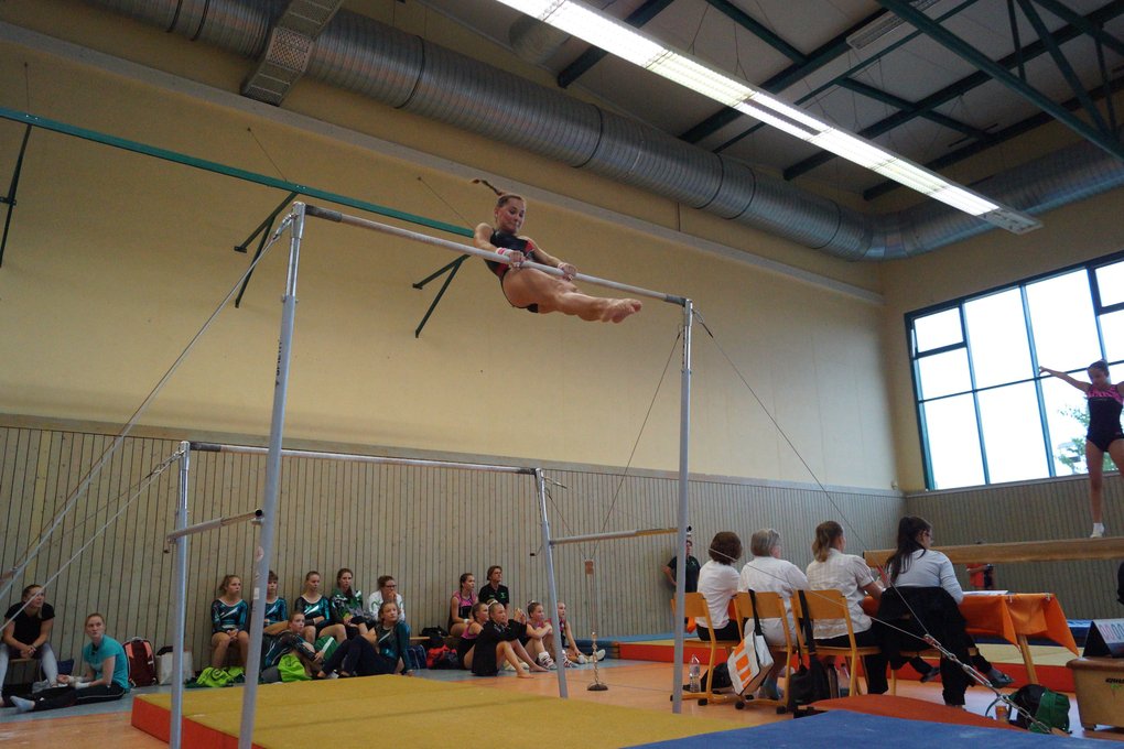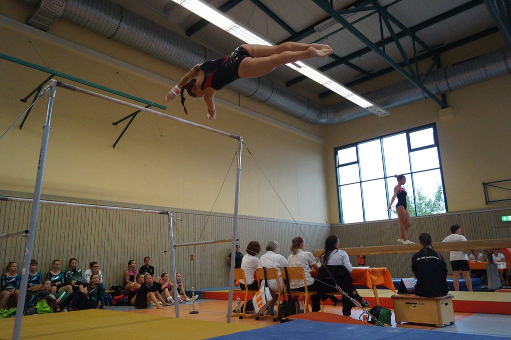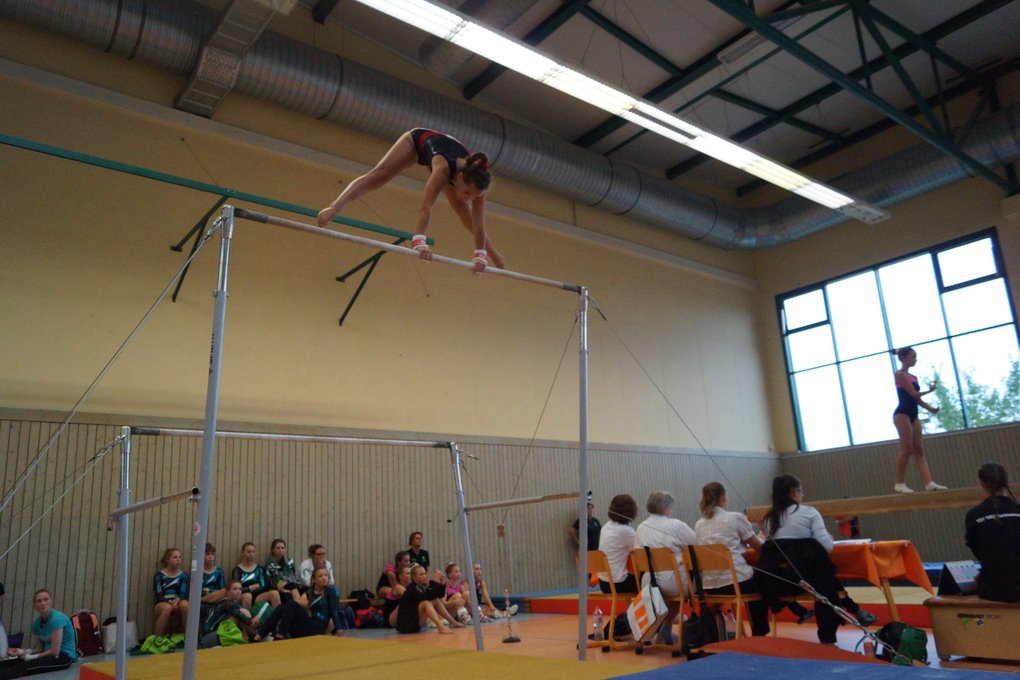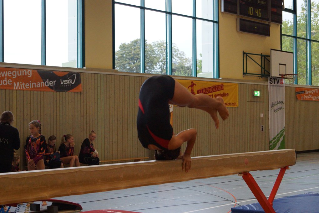 Nach nur drei Wochen Vorbereitung mussten sich unsere beiden Ligamannschaften in Pirna der schweren Aufgabe 2.Landesliga stellen. Vormittags begann unsere Mädchenmannschaft LK3. Mit viel Kampfgeist ging es an die Geräte. Nachdem am Stufenbarren alle ihre Übung präsentiert hatten, legte sich die erste Anspannung. Der Punktestand im Protokoll am Stufenbarren zeigte dann auch, das wir das beste Egebniss aller Mannschaften an diesem Gerät erturnten. Die anschließenden Übungen am Schwebebalken waren erwartungsgemäß noch etwas zittrig und alle waren froh das Gerät überstanden zu haben. Hier zeigten auch die anderen Mannschaften Nerven, was uns Platz drei an diesem Gerät bescherte. Weiter ging es zum Boden. Hier machte sich der Trainingsrückstand noch am deutlichsten bemerkbar. Auf der 12x12 m großen Matte wirkten unsere Übungen sehr zaghaft, was auch die Wertungen widerspiegelten. Nach dieser kleinen Enttäuschung ging es weiter zum Sprung. Dort gab es von Jasmin den besten Überschlag an diesem Tag. Auch die Anderen zeigten solide Sprünge. Nach diesem gelungenen Wettkampf war klar, dass wir uns keine Abstiegssorgen machen müssen. Der Jubel über den erreichten Platz 4 war entsprechend groß. Am Ende bedeutet dieser dismal sogar, dass wir im Oktober beim Relegationwettkampf noch einmal antreten dürfen.