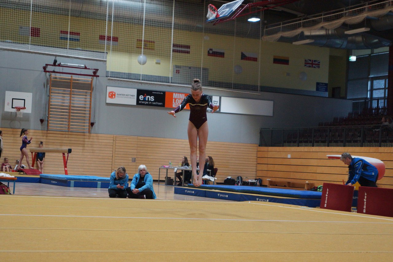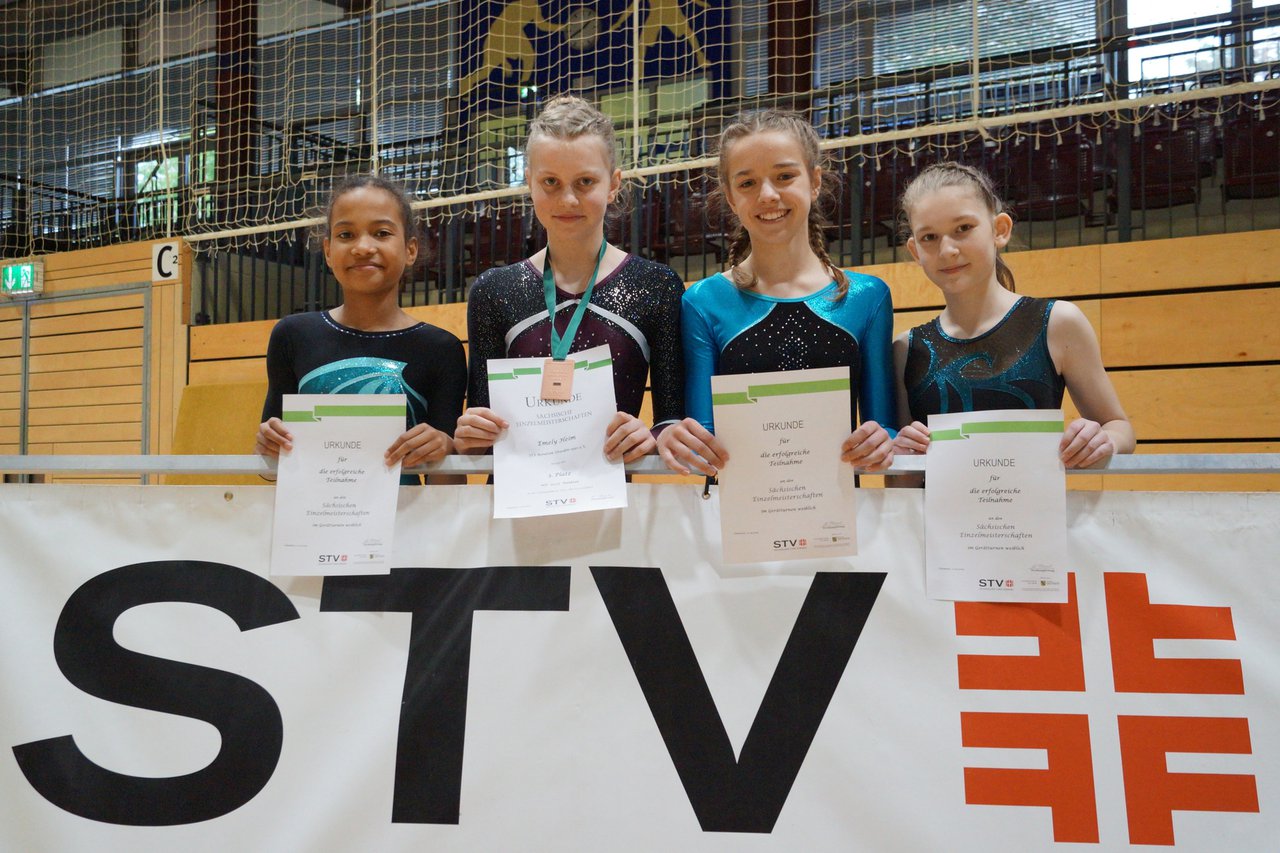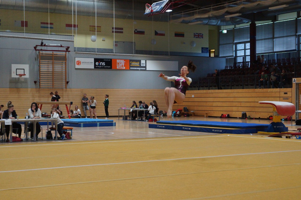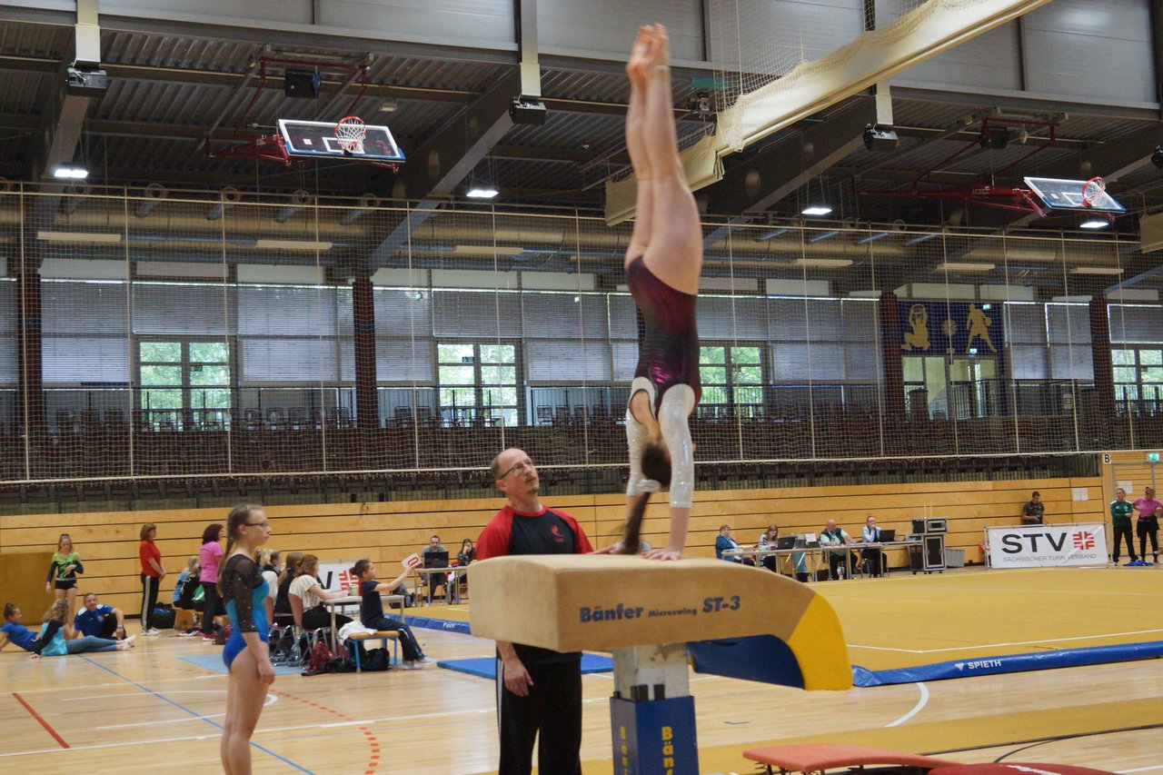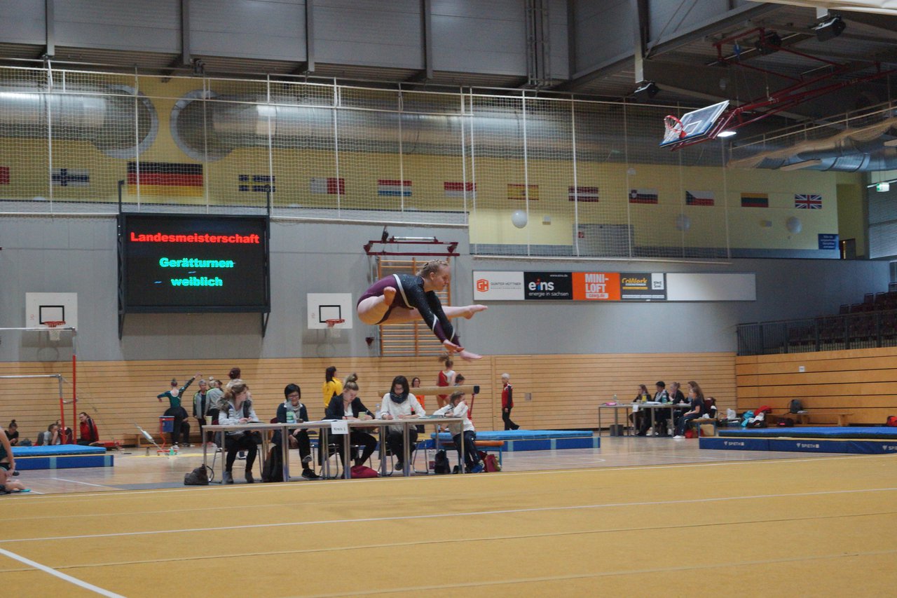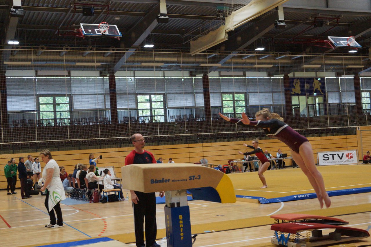 In der wie immer perfekt vorbereiteten Chemnitzer Richard Hartmann kämpften am 11. Mai sechs Turnerinnen unseres Vereines um die begehrten Sachsenmeister- Titel in der LK 3. Alle hatten sich viel vorgenommen und sehr fleißig für diesen Höhepunkt trainiert. In der AK 12/13 gingen Emely, Ivie und Milena an den Start. Für Milena und Ivie war das die erste Sachsenmeisterschaft in der LK 3, nachdem sie im letzten Jahr 3. und 6. in der LK4 belegt hatten. Leider lief es am Schwebebalken nicht optimal und am Boden wurden nicht alle Schwierigkeiten anerkannt, so dass nur Platz 10 (Ivie) und 14 (Milena) heraus kamen. Emely, inzwischen ein "alter Hase" in dieser Klasse bewies wieder einmal starke Nerven an allen Geräten. Sie zeigte die beste Stufenbarrenübung und verbesserte ihre Leistung am Boden mit einer neuen Übung noch einmal deutlich. Am Ende errang sie die Bronzemedaille. Alma startete eine Altersklasse höher und zeigte solide Leistungen, konnte aber bei den Älteren noch nicht mithalten. Am Ende wurde es Platz 15. Am Nachmittag gingen Marla (AK 16/17) und Felicitas (AK 18+) für uns an den Start. Für Marla war es die erste Sachsenmeisterschaft im Kürbereich. Leider kostete sie ein Sturz vom Balken die Chance auf Platz 6. Am Ende wurde sie 11. Felicitas turnte wie gewohnt durch, verpasste durch einige Wackler am Balken und etwas niedrige Wertungen an ihren Paradegeräten Sprung und Barren ganz knapp die Bronzemedaille.