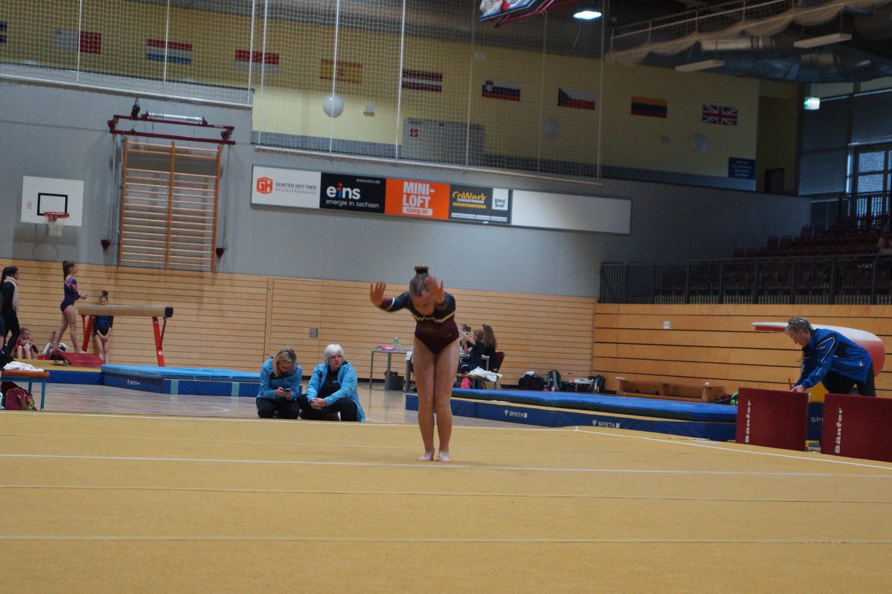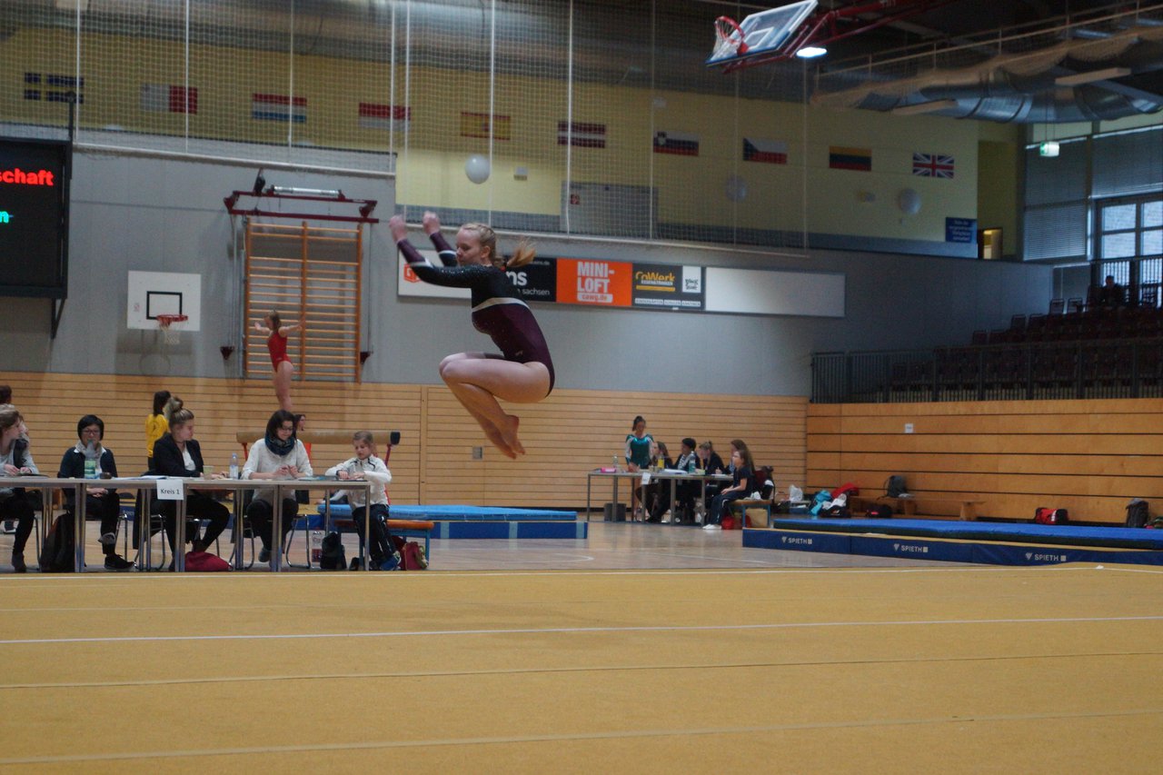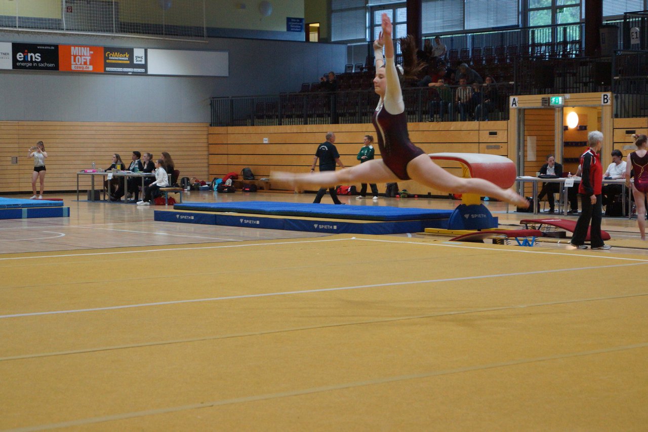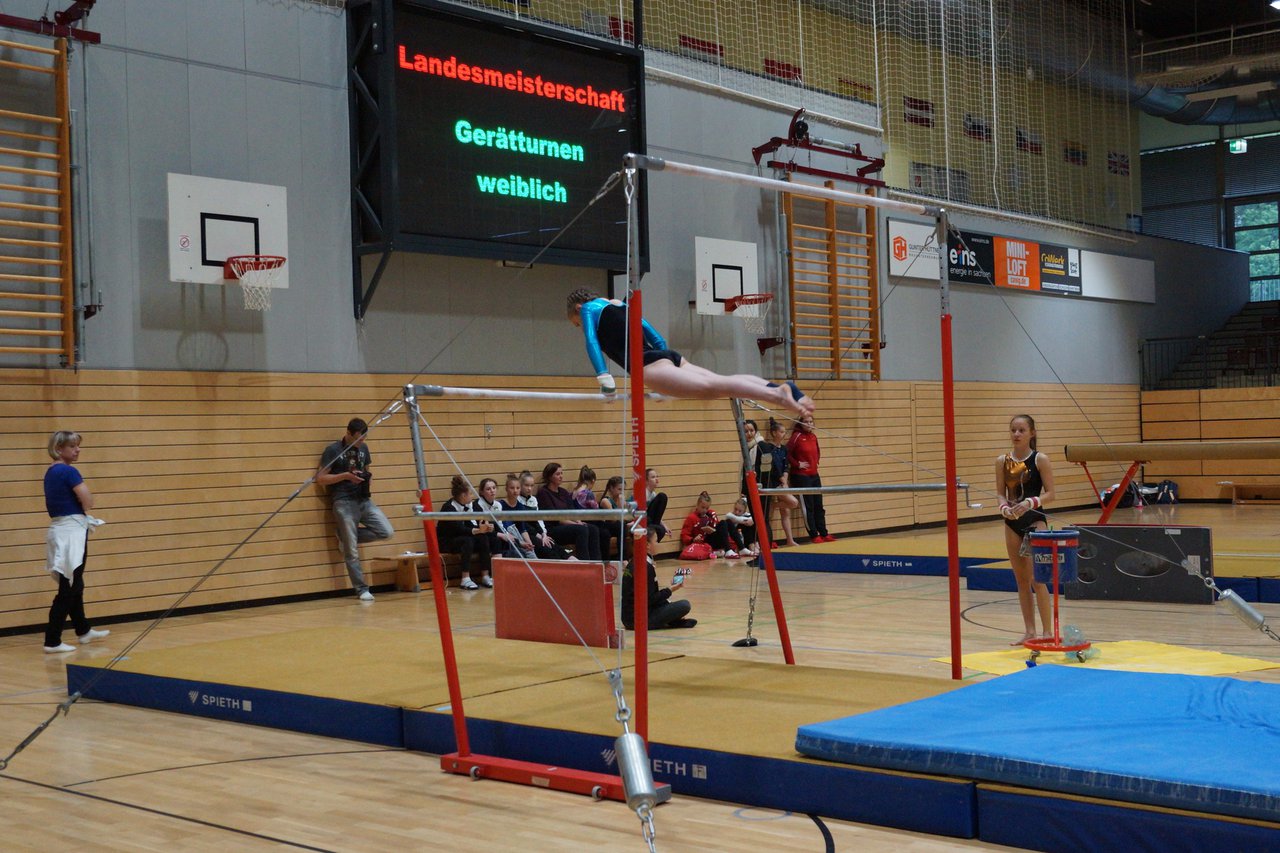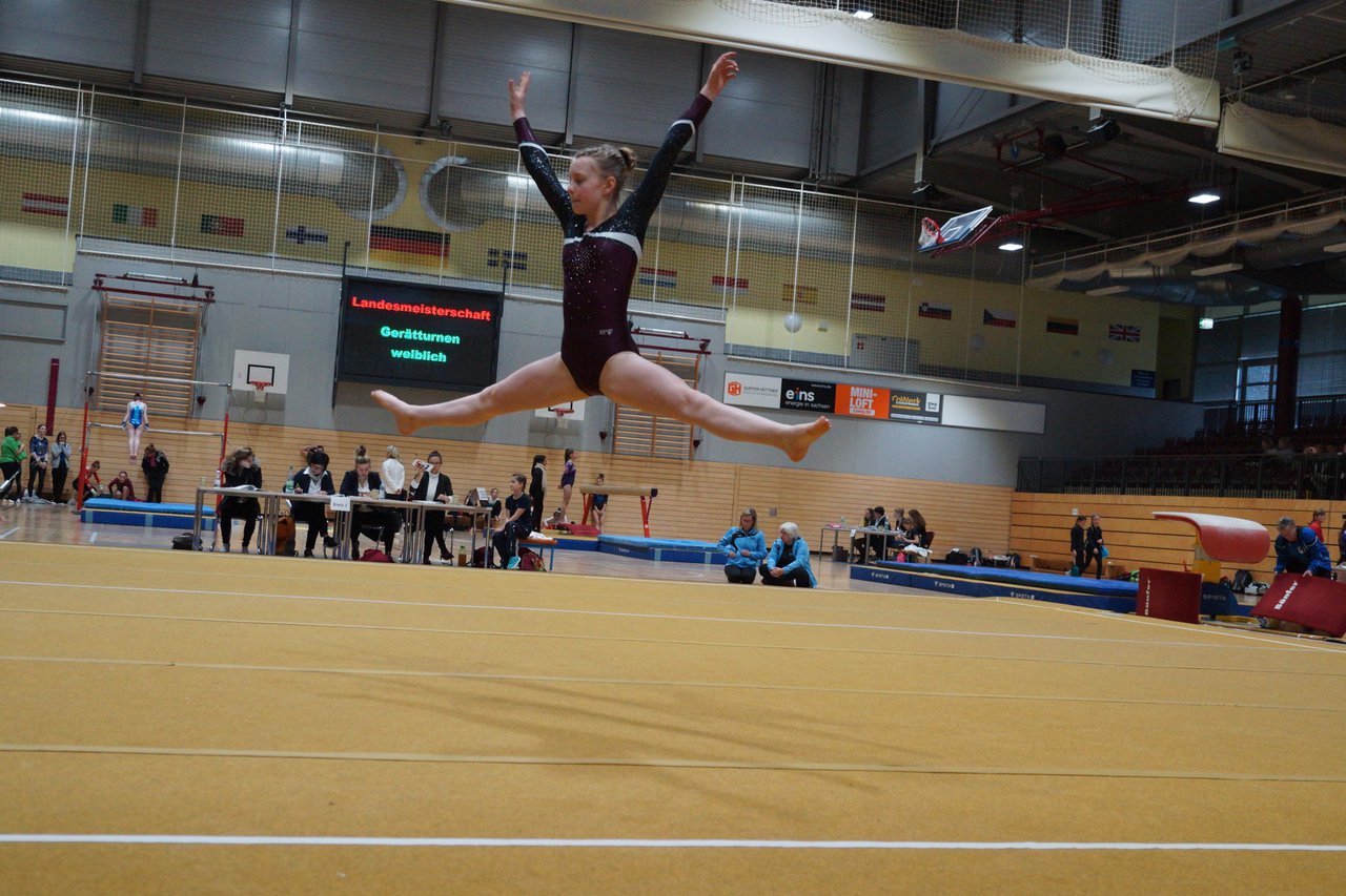 In der wie immer perfekt vorbereiteten Chemnitzer Richard Hartmann kämpften am 11. Mai sechs Turnerinnen unseres Vereines um die begehrten Sachsenmeister- Titel in der LK 3. Alle hatten sich viel vorgenommen und sehr fleißig für diesen Höhepunkt trainiert. In der AK 12/13 gingen Emely, Ivie und Milena an den Start. Für Milena und Ivie war das die erste Sachsenmeisterschaft in der LK 3, nachdem sie im letzten Jahr 3. und 6. in der LK4 belegt hatten. Leider lief es am Schwebebalken nicht optimal und am Boden wurden nicht alle Schwierigkeiten anerkannt, so dass nur Platz 10 (Ivie) und 14 (Milena) heraus kamen. Emely, inzwischen ein "alter Hase" in dieser Klasse bewies wieder einmal starke Nerven an allen Geräten. Sie zeigte die beste Stufenbarrenübung und verbesserte ihre Leistung am Boden mit einer neuen Übung noch einmal deutlich. Am Ende errang sie die Bronzemedaille. Alma startete eine Altersklasse höher und zeigte solide Leistungen, konnte aber bei den Älteren noch nicht mithalten. Am Ende wurde es Platz 15. Am Nachmittag gingen Marla (AK 16/17) und Felicitas (AK 18+) für uns an den Start. Für Marla war es die erste Sachsenmeisterschaft im Kürbereich. Leider kostete sie ein Sturz vom Balken die Chance auf Platz 6. Am Ende wurde sie 11. Felicitas turnte wie gewohnt durch, verpasste durch einige Wackler am Balken und etwas niedrige Wertungen an ihren Paradegeräten Sprung und Barren ganz knapp die Bronzemedaille.