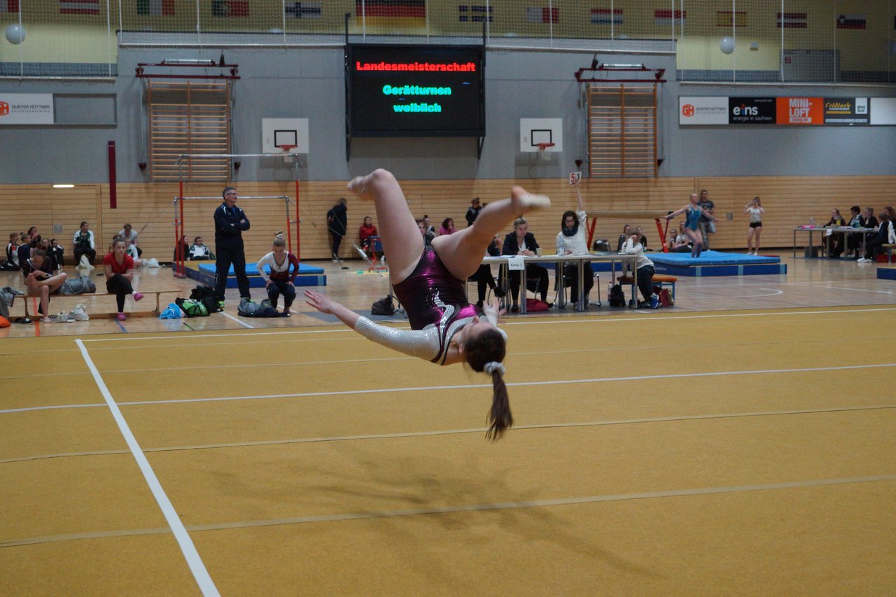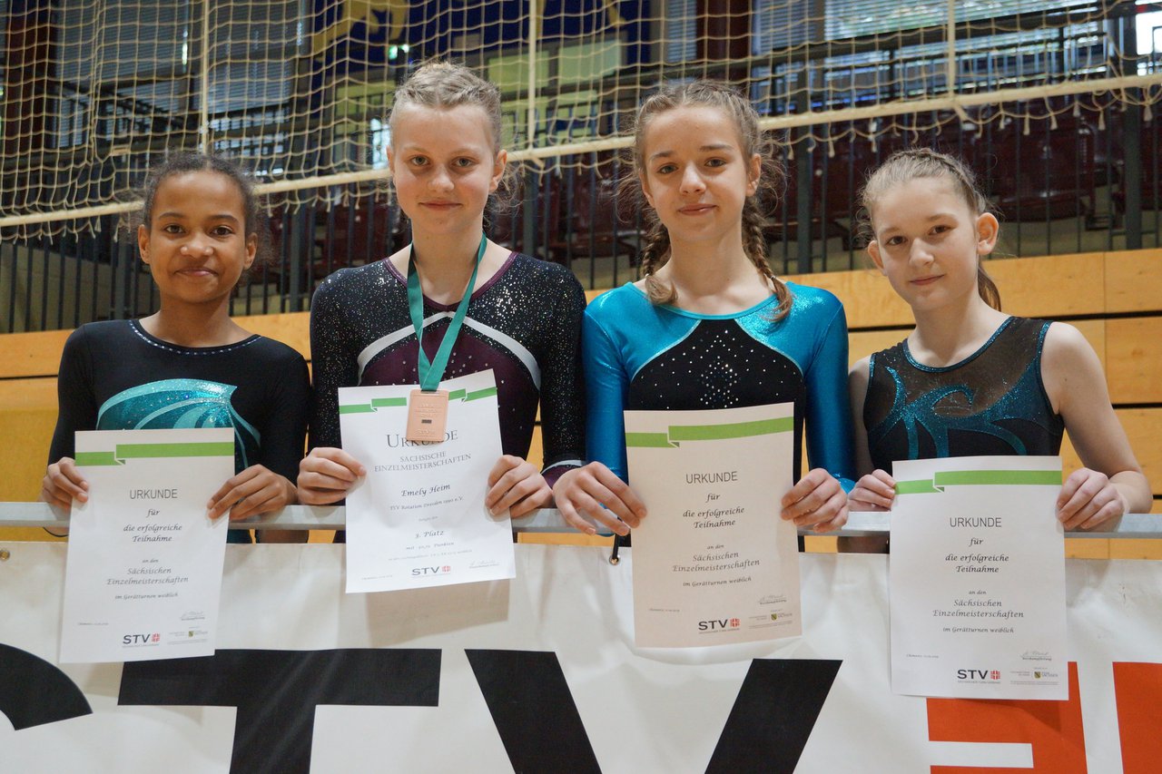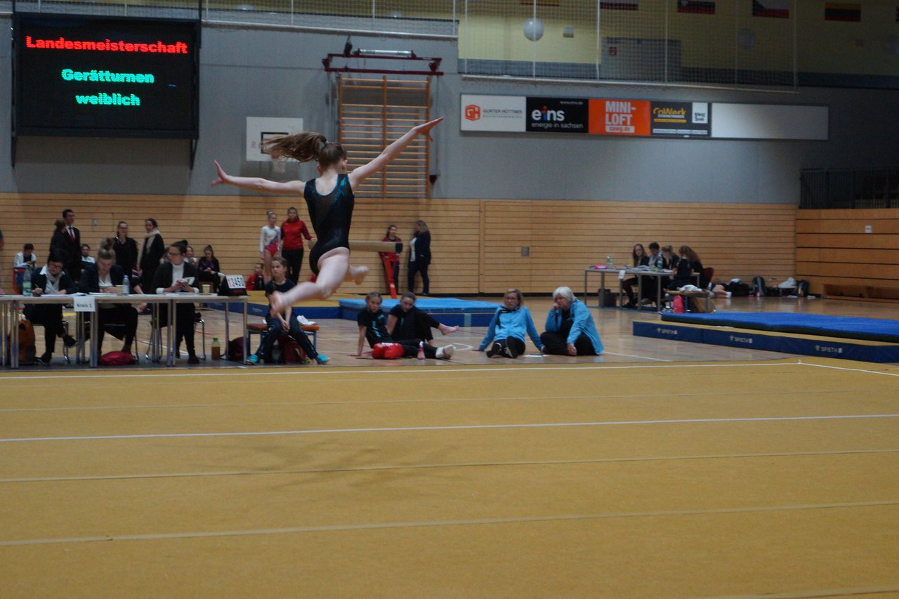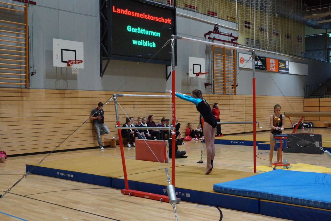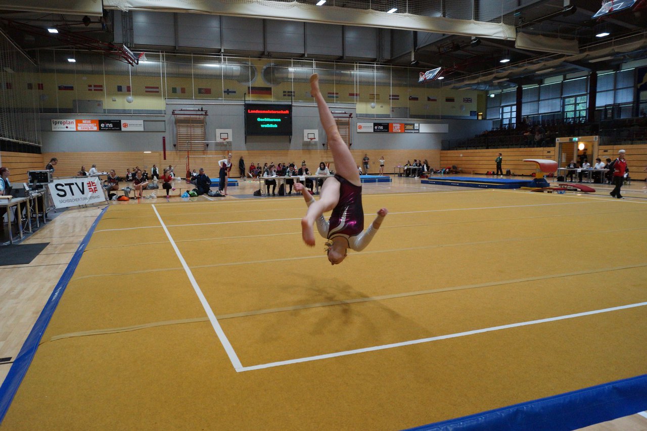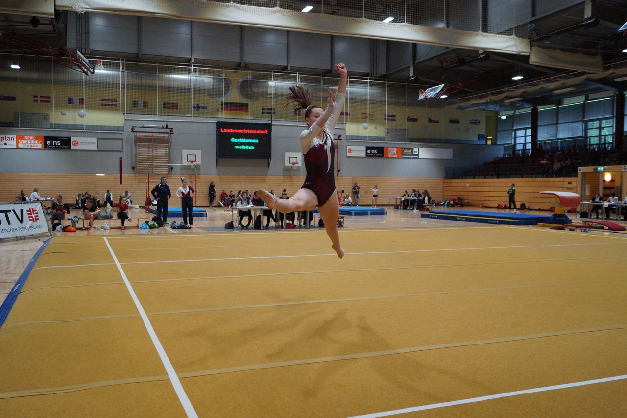 In der wie immer perfekt vorbereiteten Chemnitzer Richard Hartmann kämpften am 11. Mai sechs Turnerinnen unseres Vereines um die begehrten Sachsenmeister- Titel in der LK 3. Alle hatten sich viel vorgenommen und sehr fleißig für diesen Höhepunkt trainiert. In der AK 12/13 gingen Emely, Ivie und Milena an den Start. Für Milena und Ivie war das die erste Sachsenmeisterschaft in der LK 3, nachdem sie im letzten Jahr 3. und 6. in der LK4 belegt hatten. Leider lief es am Schwebebalken nicht optimal und am Boden wurden nicht alle Schwierigkeiten anerkannt, so dass nur Platz 10 (Ivie) und 14 (Milena) heraus kamen. Emely, inzwischen ein "alter Hase" in dieser Klasse bewies wieder einmal starke Nerven an allen Geräten. Sie zeigte die beste Stufenbarrenübung und verbesserte ihre Leistung am Boden mit einer neuen Übung noch einmal deutlich. Am Ende errang sie die Bronzemedaille. Alma startete eine Altersklasse höher und zeigte solide Leistungen, konnte aber bei den Älteren noch nicht mithalten. Am Ende wurde es Platz 15. Am Nachmittag gingen Marla (AK 16/17) und Felicitas (AK 18+) für uns an den Start. Für Marla war es die erste Sachsenmeisterschaft im Kürbereich. Leider kostete sie ein Sturz vom Balken die Chance auf Platz 6. Am Ende wurde sie 11. Felicitas turnte wie gewohnt durch, verpasste durch einige Wackler am Balken und etwas niedrige Wertungen an ihren Paradegeräten Sprung und Barren ganz knapp die Bronzemedaille.