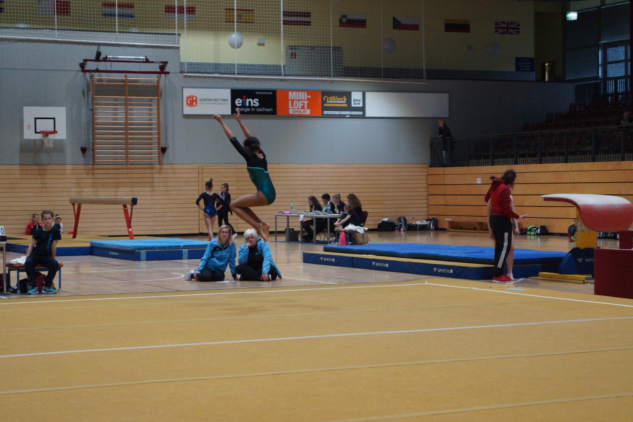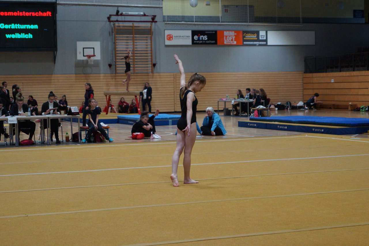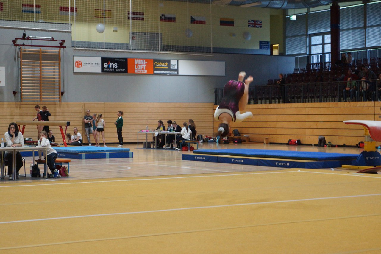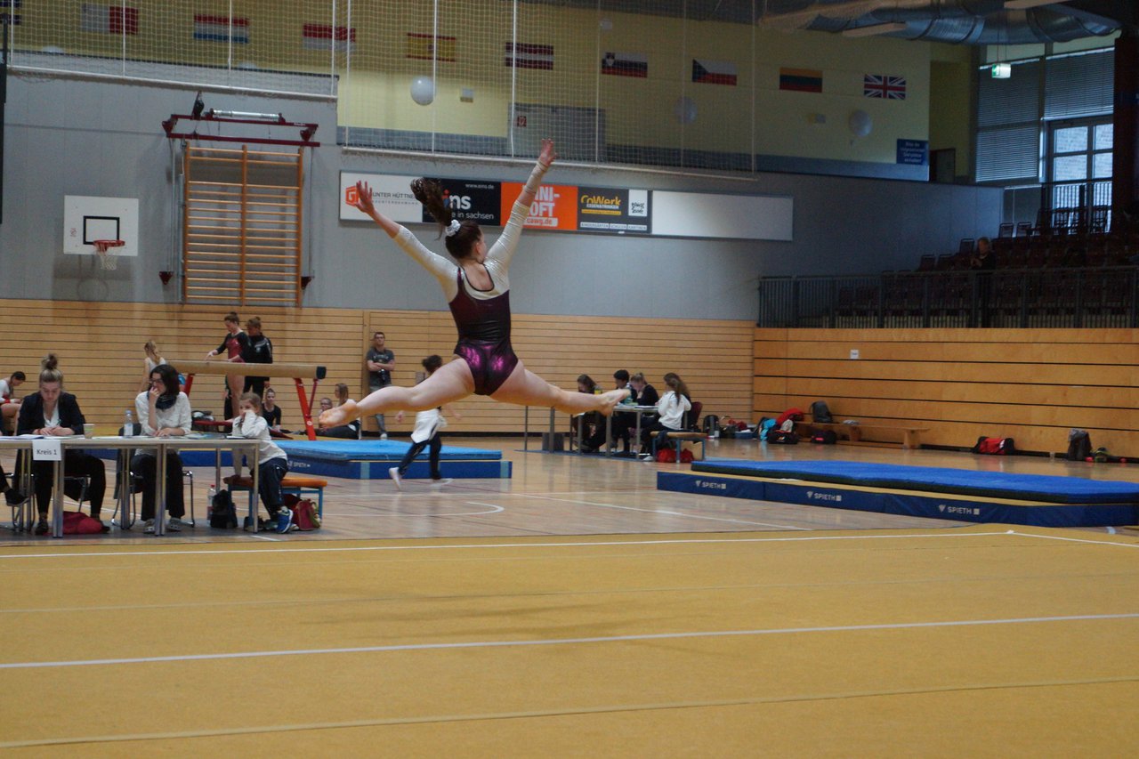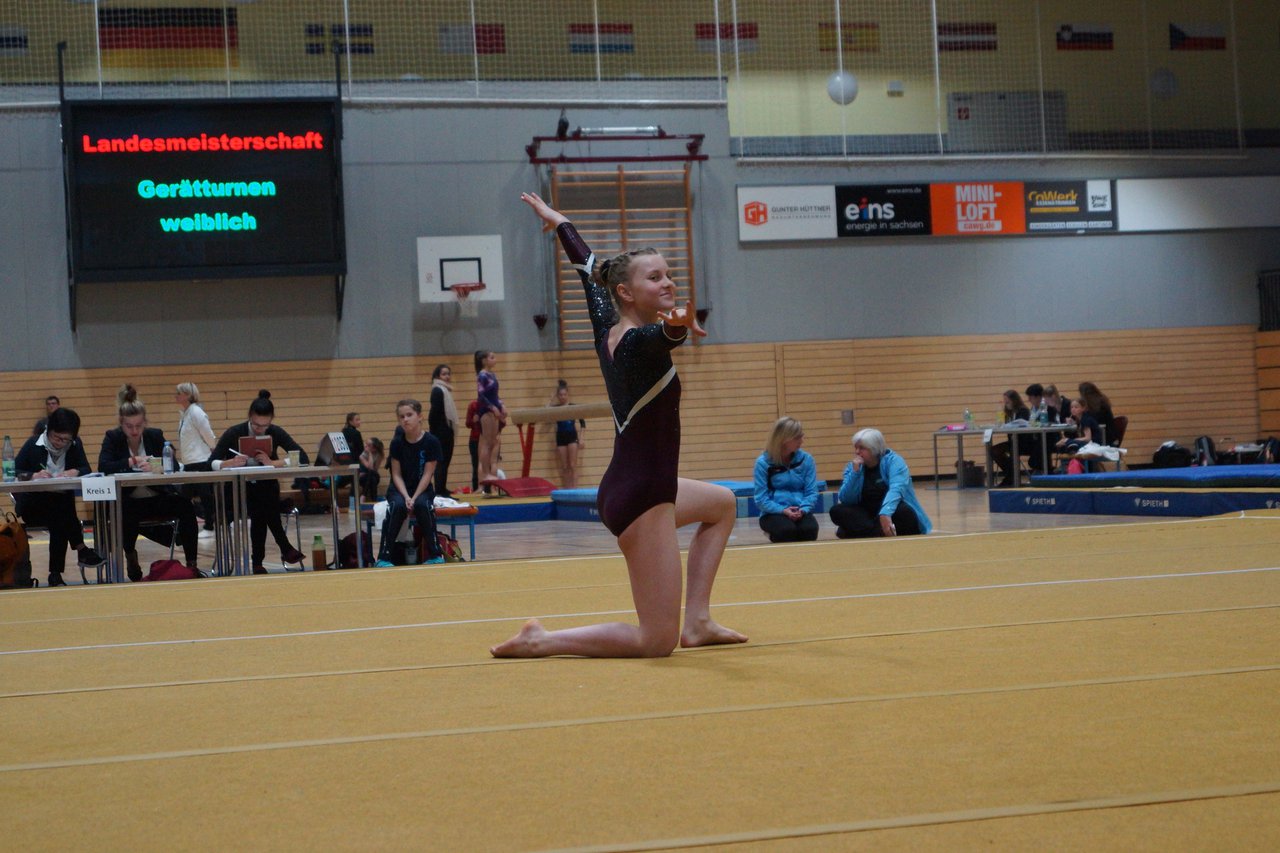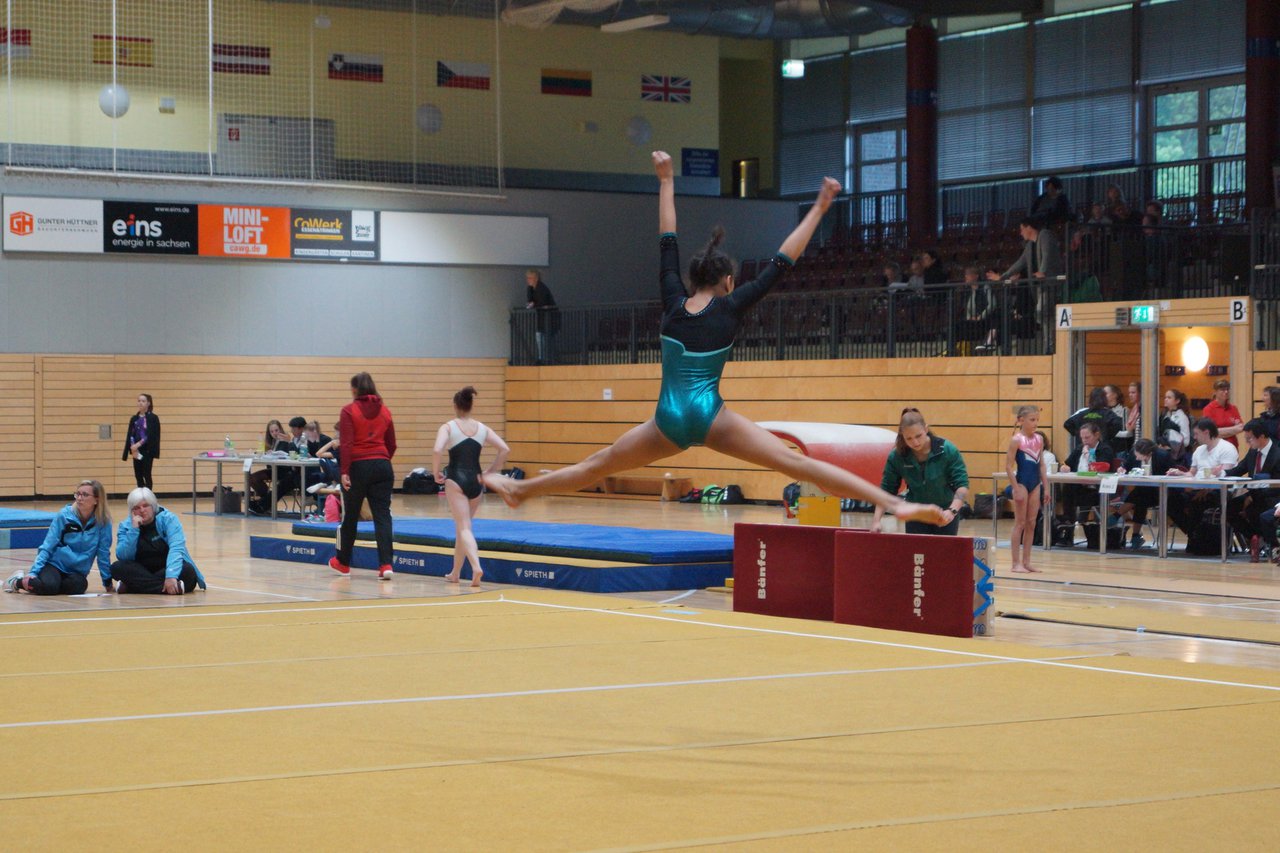 In der wie immer perfekt vorbereiteten Chemnitzer Richard Hartmann kämpften am 11. Mai sechs Turnerinnen unseres Vereines um die begehrten Sachsenmeister- Titel in der LK 3. Alle hatten sich viel vorgenommen und sehr fleißig für diesen Höhepunkt trainiert. In der AK 12/13 gingen Emely, Ivie und Milena an den Start. Für Milena und Ivie war das die erste Sachsenmeisterschaft in der LK 3, nachdem sie im letzten Jahr 3. und 6. in der LK4 belegt hatten. Leider lief es am Schwebebalken nicht optimal und am Boden wurden nicht alle Schwierigkeiten anerkannt, so dass nur Platz 10 (Ivie) und 14 (Milena) heraus kamen. Emely, inzwischen ein "alter Hase" in dieser Klasse bewies wieder einmal starke Nerven an allen Geräten. Sie zeigte die beste Stufenbarrenübung und verbesserte ihre Leistung am Boden mit einer neuen Übung noch einmal deutlich. Am Ende errang sie die Bronzemedaille. Alma startete eine Altersklasse höher und zeigte solide Leistungen, konnte aber bei den Älteren noch nicht mithalten. Am Ende wurde es Platz 15. Am Nachmittag gingen Marla (AK 16/17) und Felicitas (AK 18+) für uns an den Start. Für Marla war es die erste Sachsenmeisterschaft im Kürbereich. Leider kostete sie ein Sturz vom Balken die Chance auf Platz 6. Am Ende wurde sie 11. Felicitas turnte wie gewohnt durch, verpasste durch einige Wackler am Balken und etwas niedrige Wertungen an ihren Paradegeräten Sprung und Barren ganz knapp die Bronzemedaille.