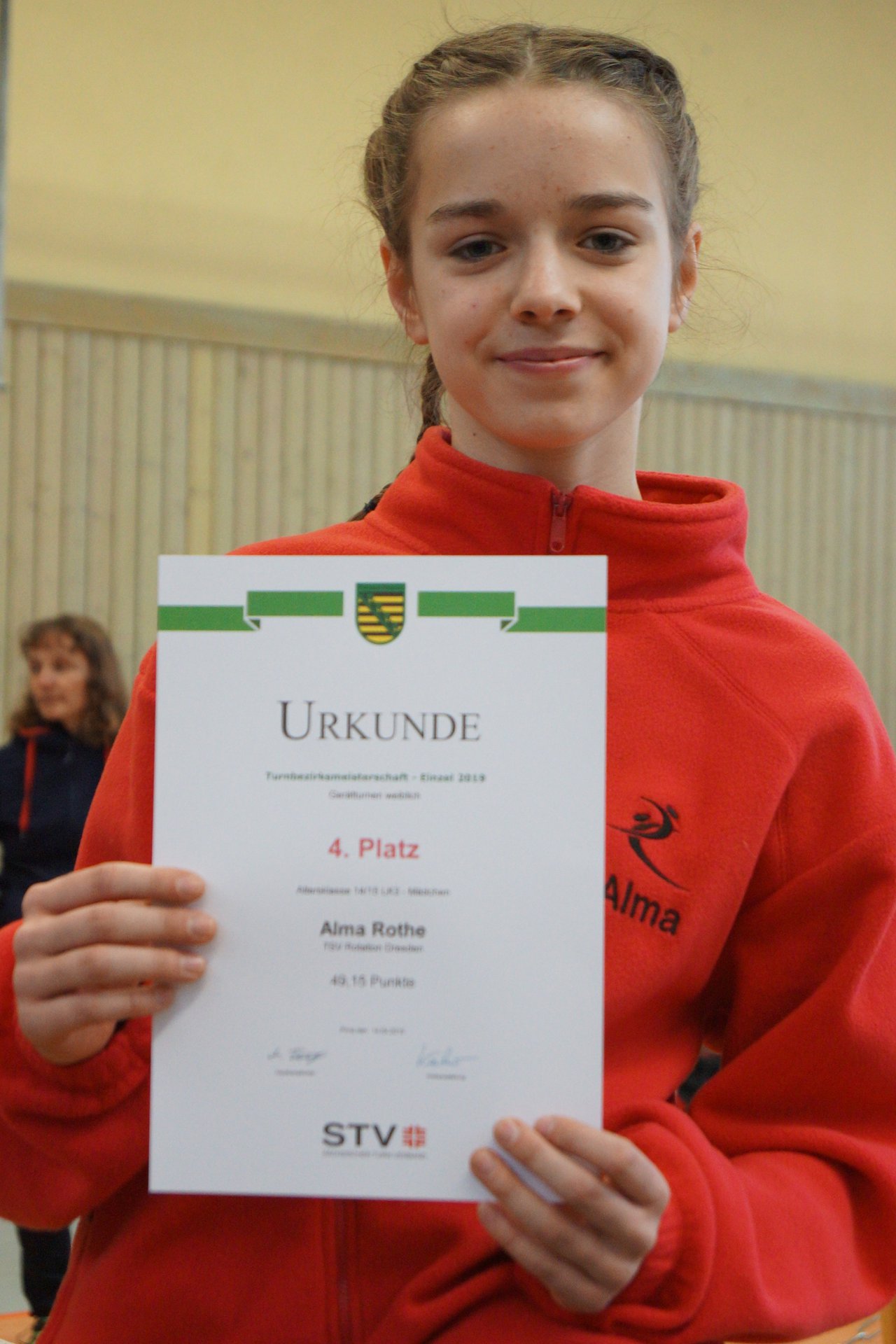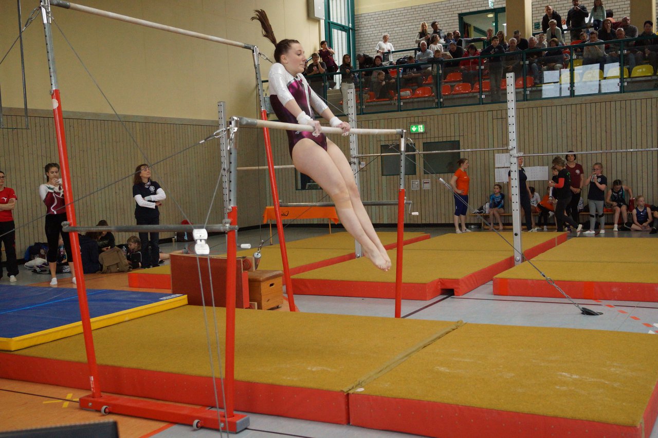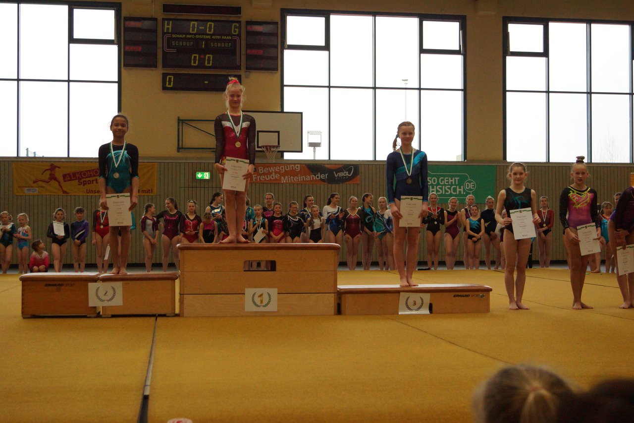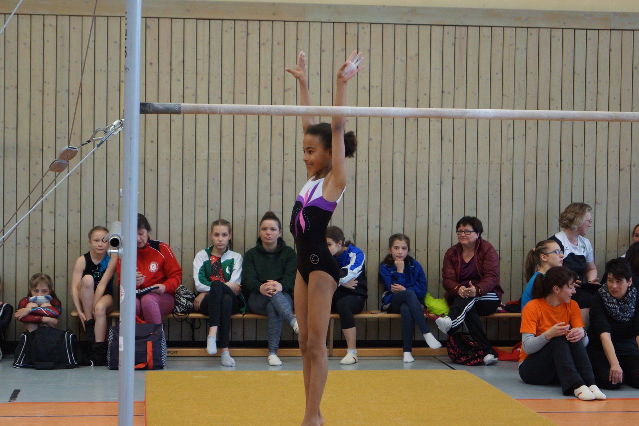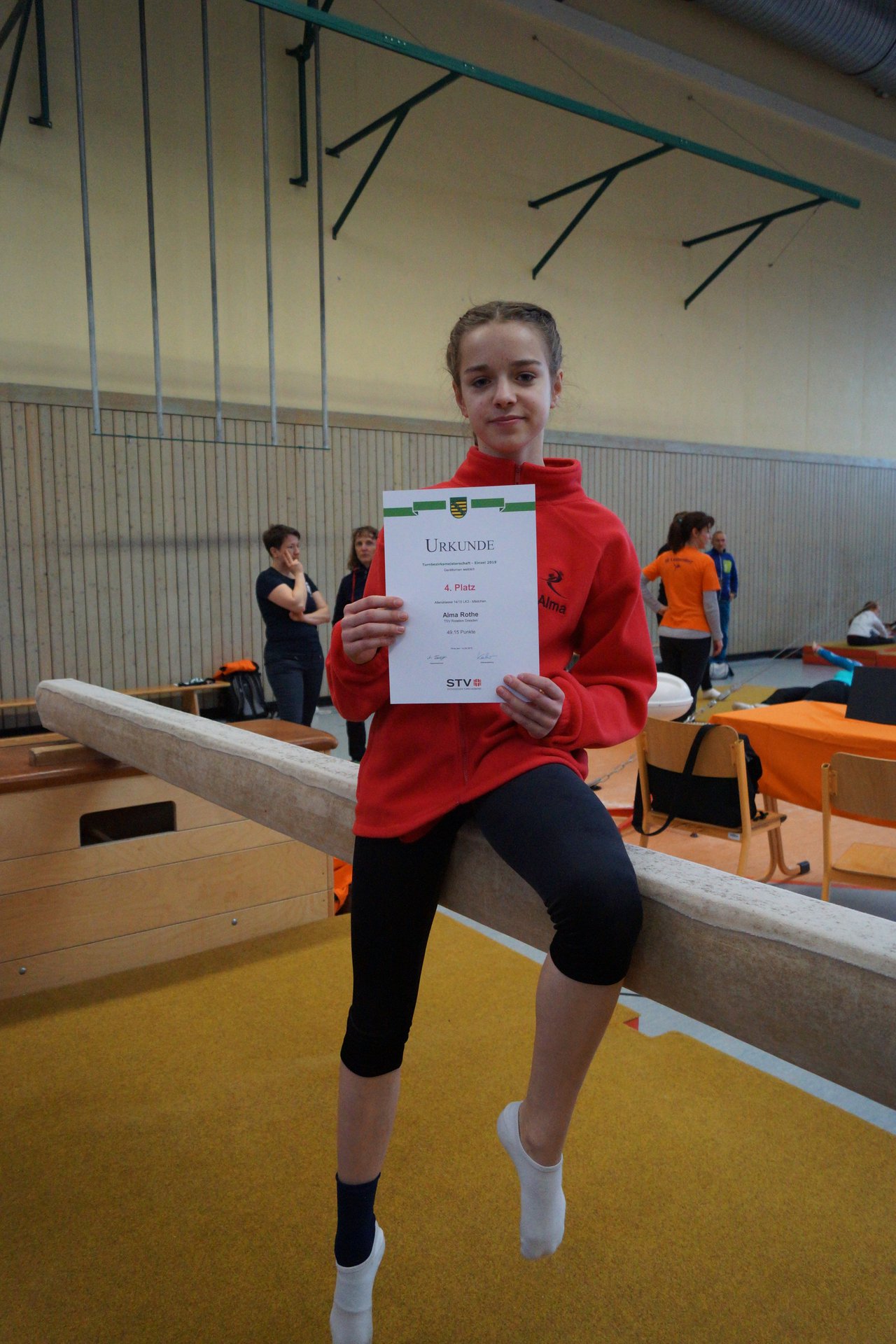Auf den Bronzerang in der gleichen Klasse schaffte es Emely, die leider eine bessere Platzierung durch ein fehlendes Element am Stufenbarren verschenkte, vor Milena. Ebenfalls Platz 4 ging an Eniye (LK 4 bis AK 11), die durch den Sturz vom Balken die Medaillenränge verpasste. Alma musste schon in der LK 3 AK 14/15 an den Start gehen und wurde ebenfalls Vierte.